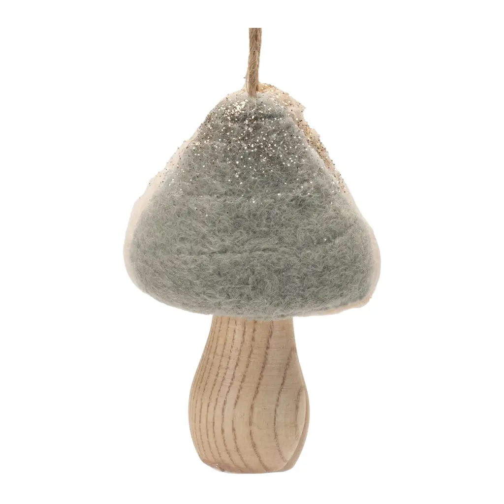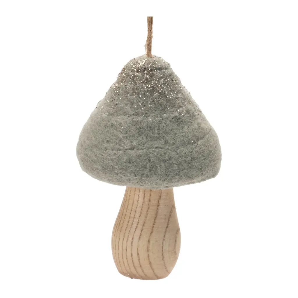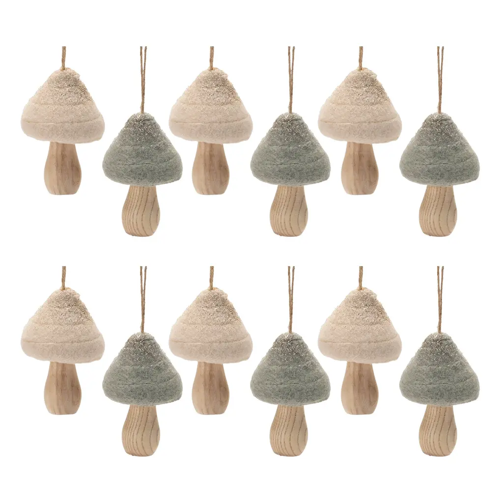 Bring whimsical woodland charm to your holiday decor with the Felt Fabric Mushroom Ornament Set. Featuring two assorted mushroom designs in wintry beige and grey tones with glittered accents, these ornaments highlight a rustic natural wood grain stem for an earthy touch. The delicate jute string hanger makes it easy to hang them on your Christmas tree, wreath, or garland. Sold in a set of twelve pieces, this collection adds a cozy and rustic vibe to any holiday display, perfect for woodland-themed decor or gifting to nature lovers.