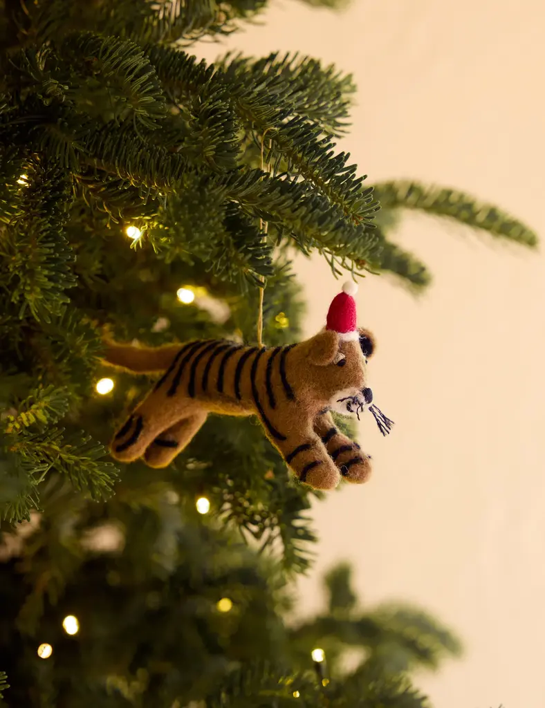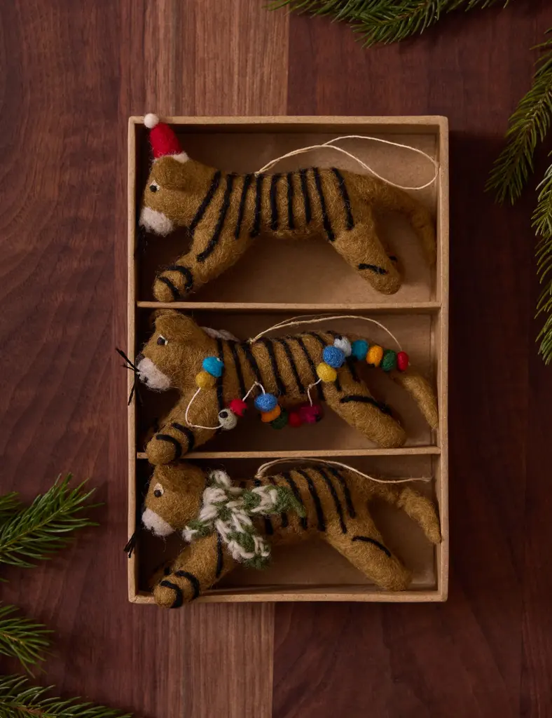 Sarah's iconic tiger printbased on her son's hand-drawn illustrationtakes full shape as charming ornaments in this 3-piece set. The felt design offers the perfect vintage touch for your tree or garland. This set of ornaments is from our exclusive Sarah Sherman Samuel collaboration and features all the trademarks of her warm, edited style.