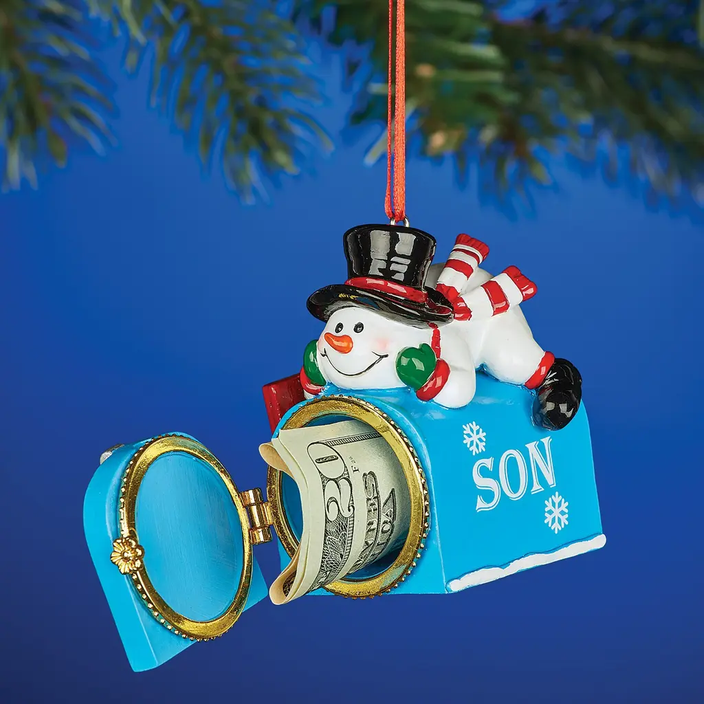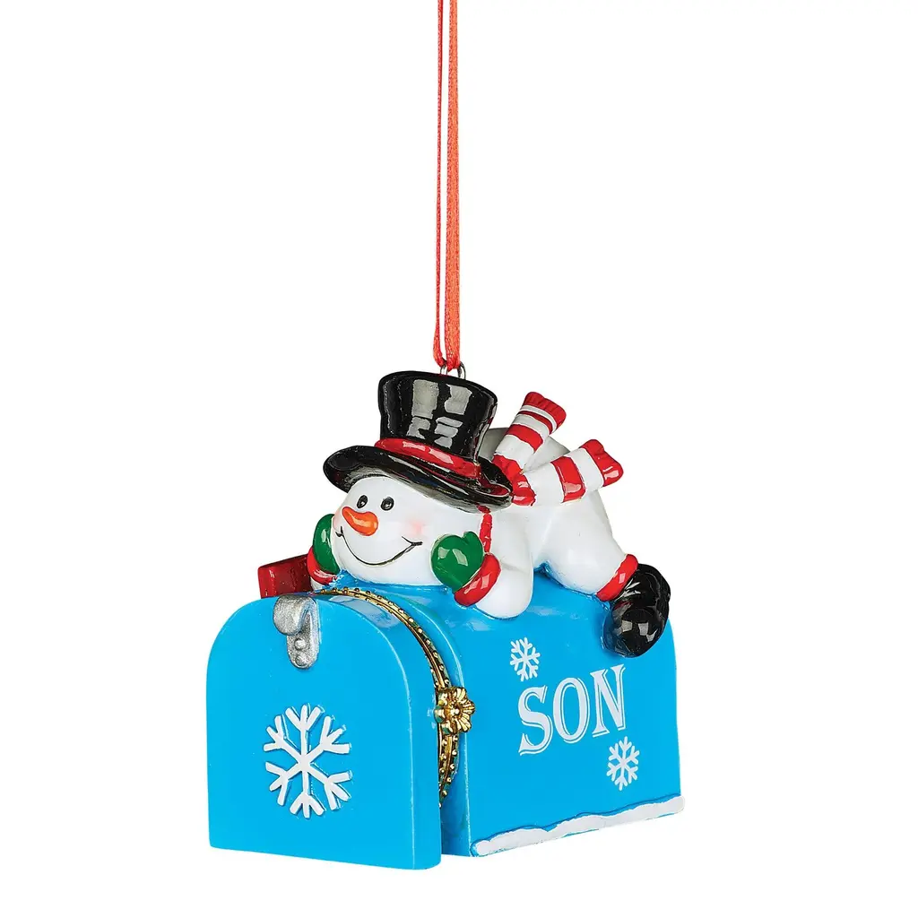 These charming mailbox ornaments decorate your tree and open up so you can put a gift inside! Available for a variety of family members, the mailboxes are topped with fun figures including Santa, a snowman, gingerbread girl and cardinals. Each features bright colors and charming details with a ribbon at the top for easy hanging. Resin. Each is approx. 2 1/2"L x 1 3/4"W x 2 1/2"H. Choose: Grandson/Santa, Son/Snowman, Granddaughter/Gingerbread or Daughter/Cardinal.