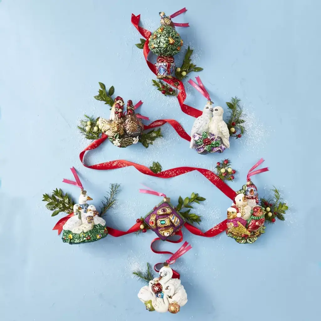 Our “12 Days of Christmas” Holiday ornament series continues with the 2018 introduction of our Five Golden Rings Ornament. These five sparkling bejeweled rings - bursting out of their bowed box - were carved first in clay and then mouth-blown in glass by old-world glass artisans in Poland. Hand-painted in golds with hand-set ruby, emerald, amethyst and sapphire colored crystals on a red bowed emerald colored box. Embellished with fine glitter details and hand-set Swarovski crystals.