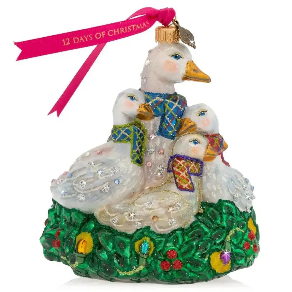 Our “12 Days of Christmas” Holiday ornament series continues with the 2018 introduction of our Four Calling Birds Ornament. These four singing birds were carved first in clay and then mouth-blown in glass by old-world glass artisans in Poland. Hand-painted in creams, canary yellow, blue and ruby with their jeweled scarves and hats while perched on lush green branches. Embellished with fine glitter details and hand-set Swarovski crystals.