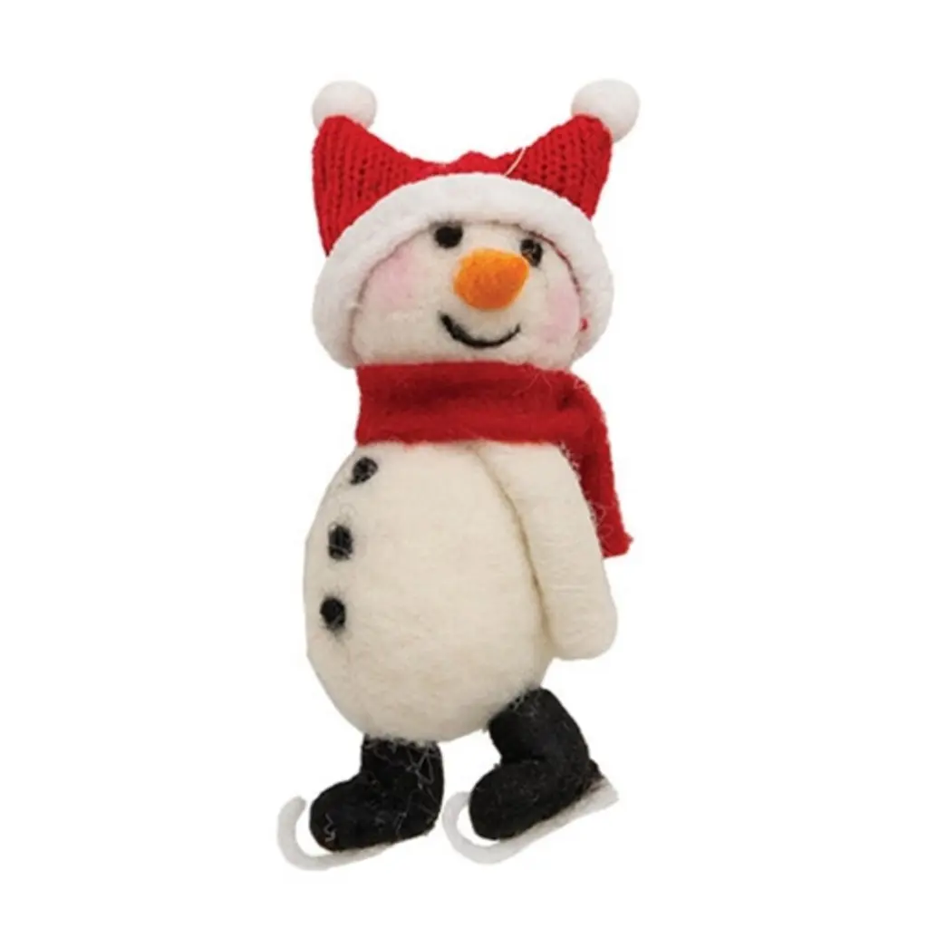 Specification:Decoration:Add a touch of festive charm to your holiday decor with the Skating Snowman Felted Ornament. This delightful ornament features a snowman crafted from soft white felt, showcasing a meticulously detailed face adorned with black beads and embroidery, along with a vibrant orange plush carrot nose. Accentuated by a cozy red knit hat and scarf, the snowman is ready for winter fun in its classic black ice skates. Versatile in design, this ornament can either stand proudly on a surface or hang gracefully from your holiday tree, making it a perfect addition to your seasonal celebrations.