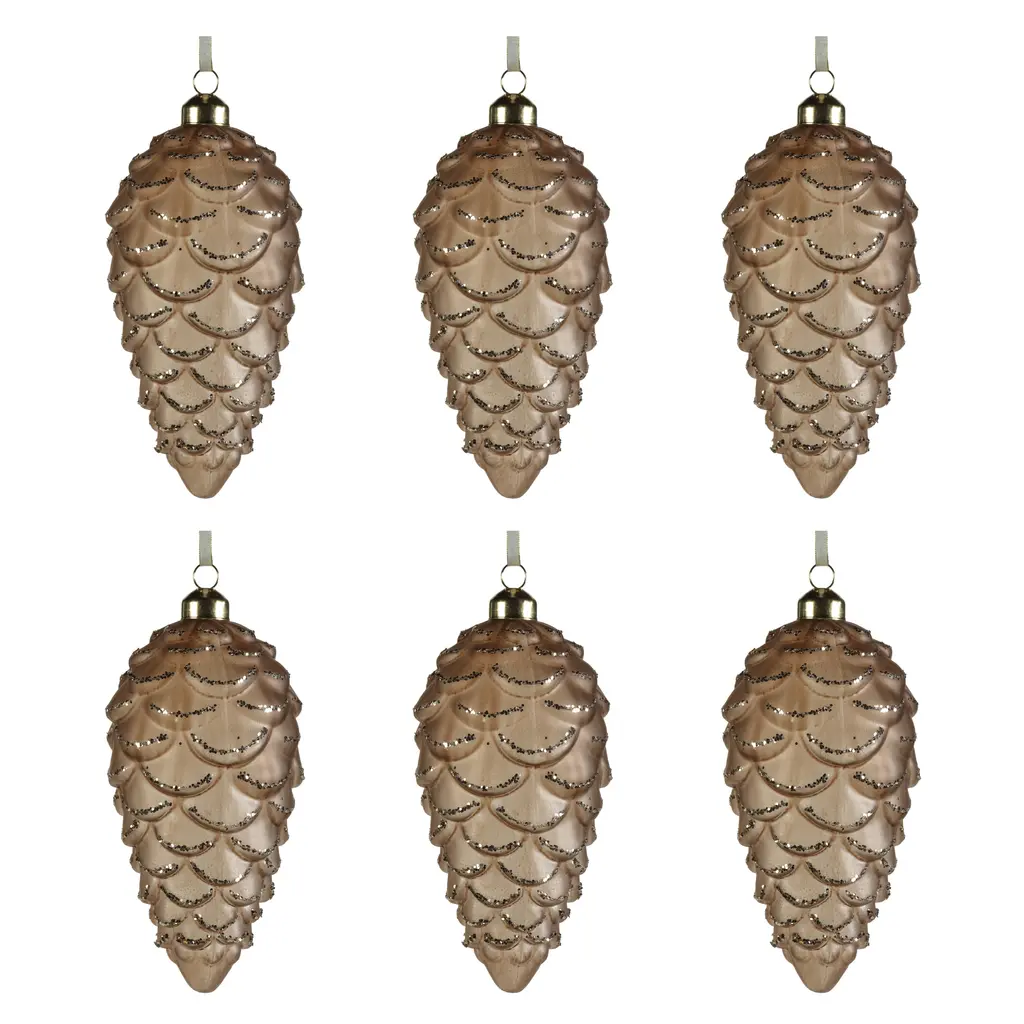 Frosted Glass Pine Cone Ornaments W/ Glitter Trim, Set Of 6 - Khaki