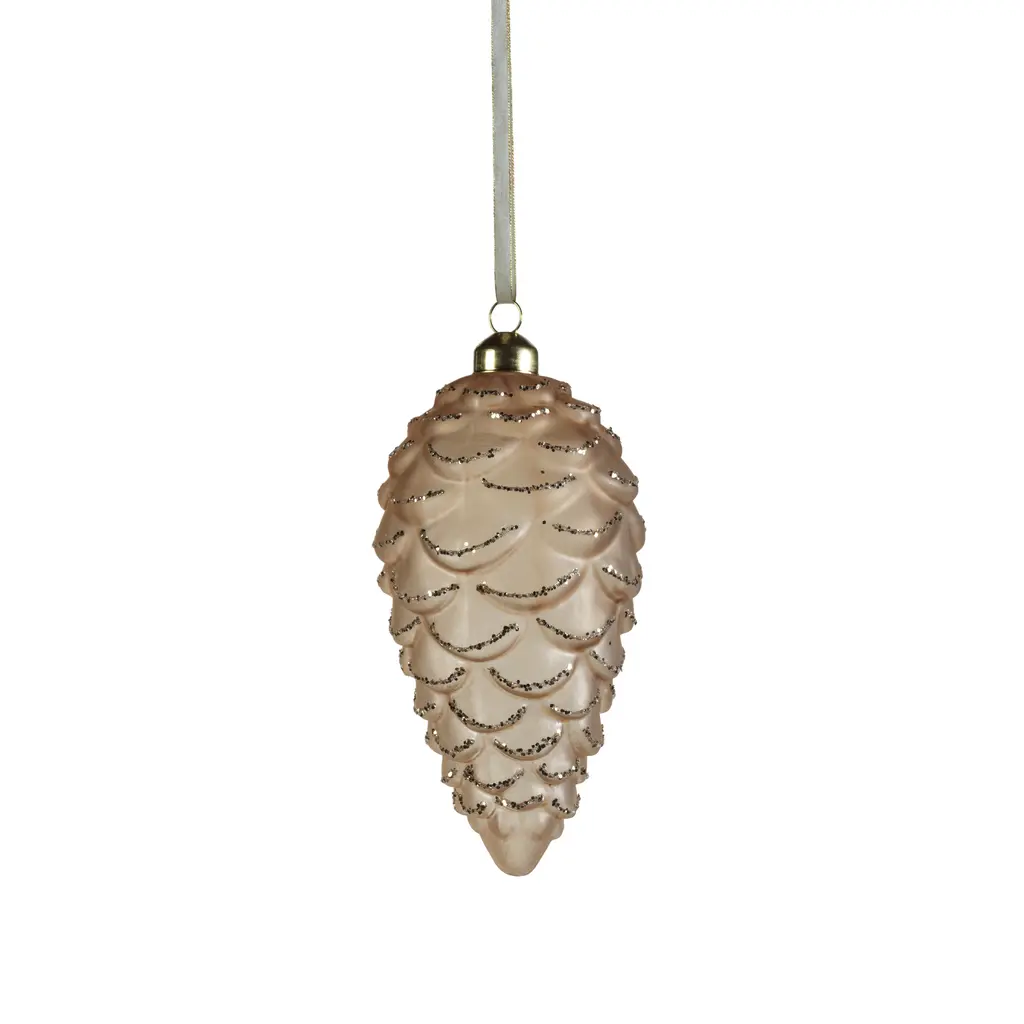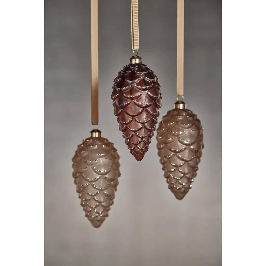 Add a rich shimmer to your holiday tree with the Pinecone Ornament Set. Beautifully crafted in earth tone glass with frosted finish and decorated with sparkling glitter trims, these elegant ornaments will deliver style and glamour to your Christmas décor. Features: Set of 6 glass Christmas ornaments of the same color Pine cone drop ornament Frosted finish for soft and diffused glow when light passes through them Each comes with a string to make it easier to hang Perfect addition to your holiday tree decor