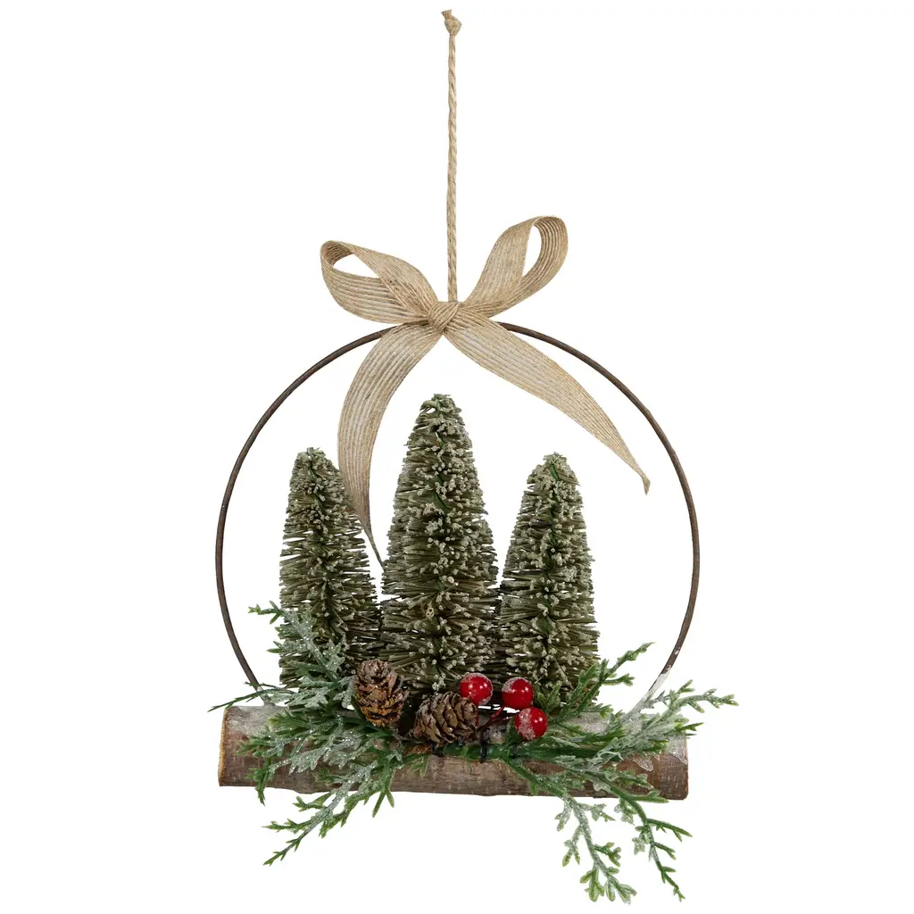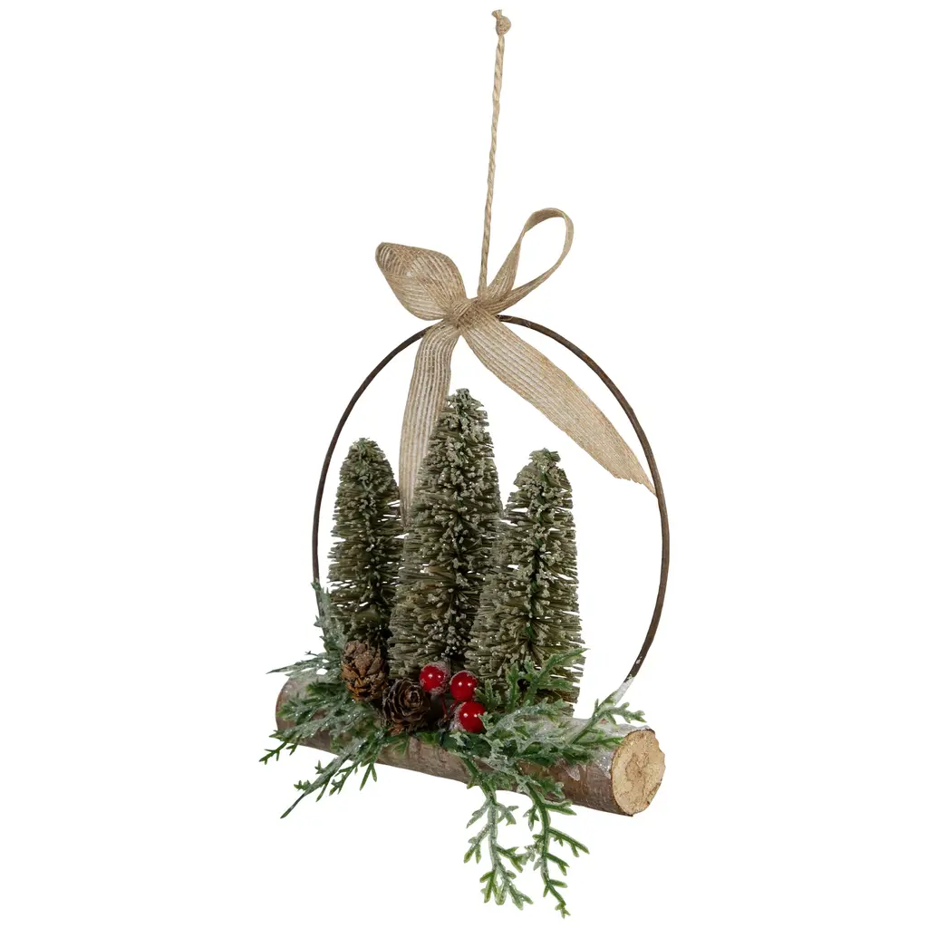 Transform your home into a winter wonderland with this frosted Christmas ornament. Featuring three frosted bottle brush trees atop a wooden log, accented with vibrant berries, pine sprigs, and pinecones, all within a metal ring frame. Complete with a striped burlap bow, this wreath exudes rustic charm and sparkle. Designed with a jute rope, it is hassle-free to hang in windows, on trees, doors, and from mantles. Add a touch of festive magic to your holiday décor with this delightful woodland hanging decoration. Product Features: Unlit Bottle brush trees on wood log ornament Red berries, pine sprigs and pinecones accents Frosted decoration is adorned with a burlap bow No assembly required – comes in 1 piece Metal ring frame with jute twine for hanging Recommended for indoor use Dimension: 7"H x 6.25"W x 2"D Material(s): pinecones/metal /foam/plastic/wood/jute