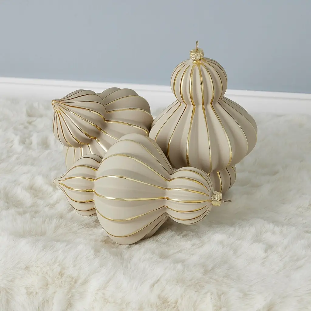 Create an air of elegance with these tastefully crafted glass Christmas tree ornaments featuring an alternating finish of matte and gloss gold. Each finial style ornament is 4.7inch (120 mm) in diameter and includes a hanging loop for display convenience. Artistic in design with handcrafted finesse, these unique tree trimmings will add a look of luxury to your holiday centerpiece year after year. Ornaments are contained in a reusable storage box.