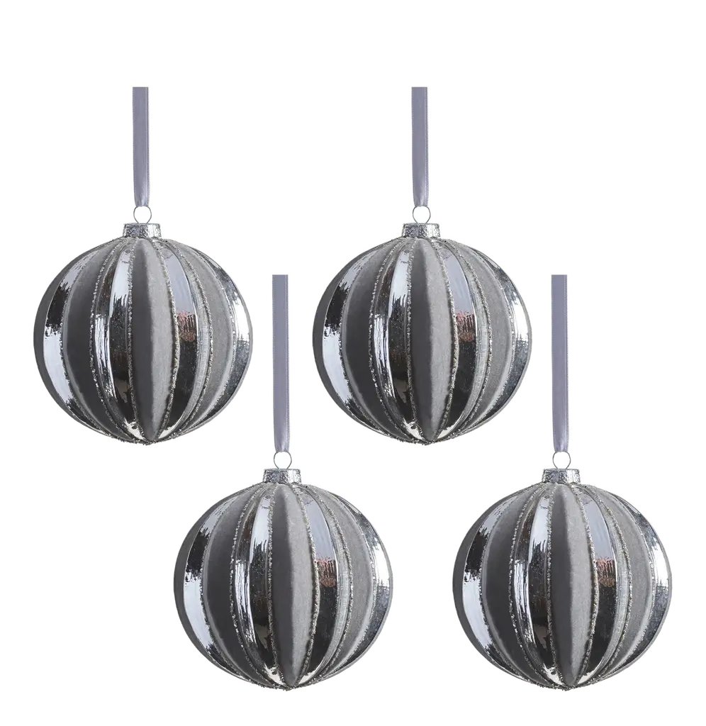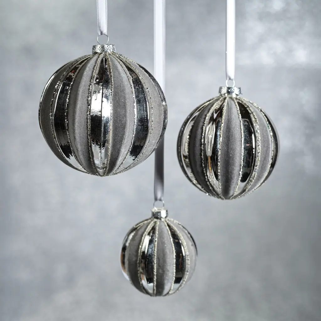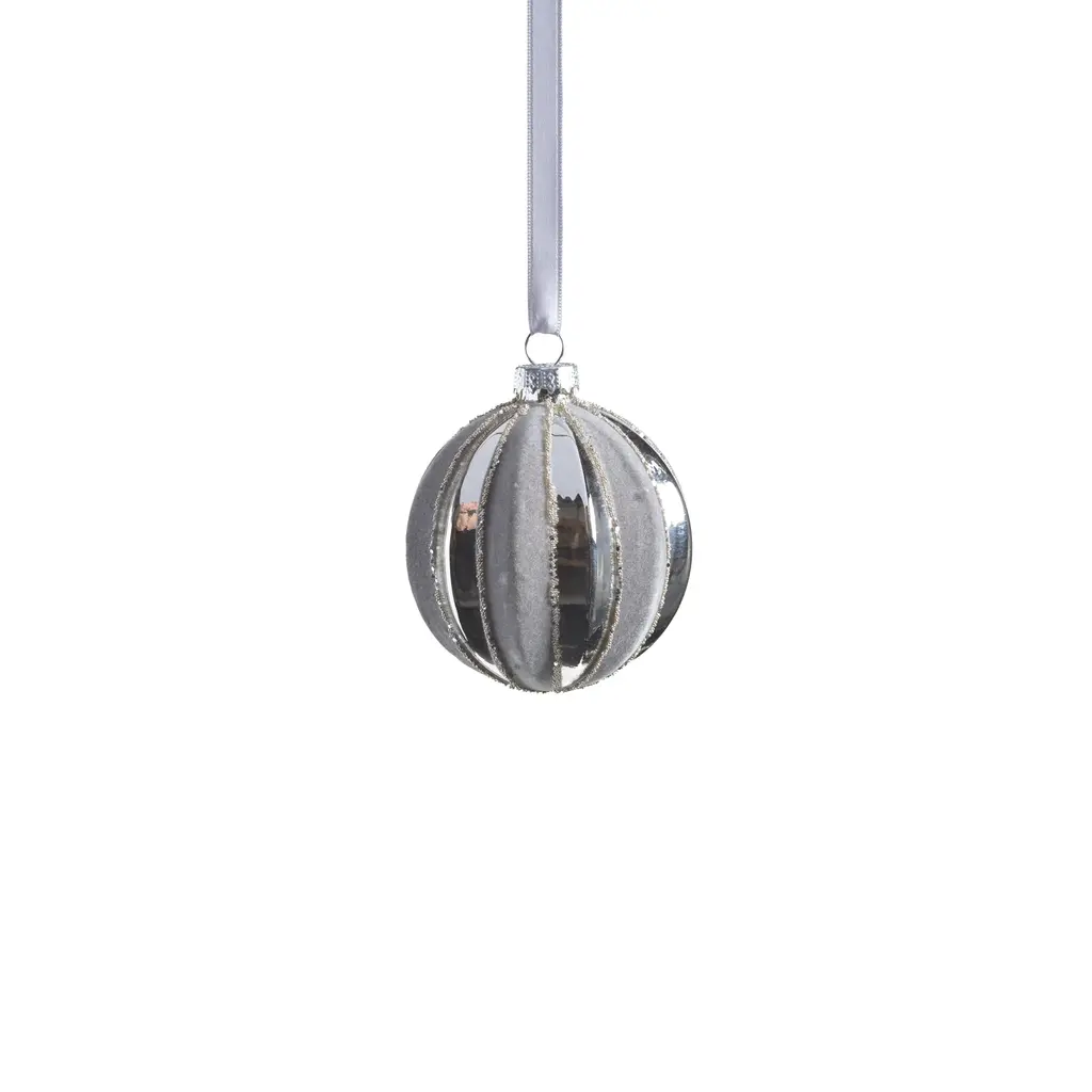 Add a touch of sophistication to your holiday décor with our Giada Shiny Glass Ball Ornaments. These stunning ornaments feature a ribbed design that alternates between a sleek shiny silver color and a soft flock light gray finish. Vertical lines of mixed glitter and tiny beads add a sparkling touch, making these ornaments a standout addition to your festive decorations. Perfect for creating a chic and elegant atmosphere, the Giada ornaments will elevate your holiday decor with their unique and refined design. Features: Set of 6 ball ornaments of the same size Ribbed design Flock and shiny finishes for sophisticated and tactile contrast Equipped with silver ornament cap Each comes with a string to make it easier to hang Perfect addition to your holiday tree decor