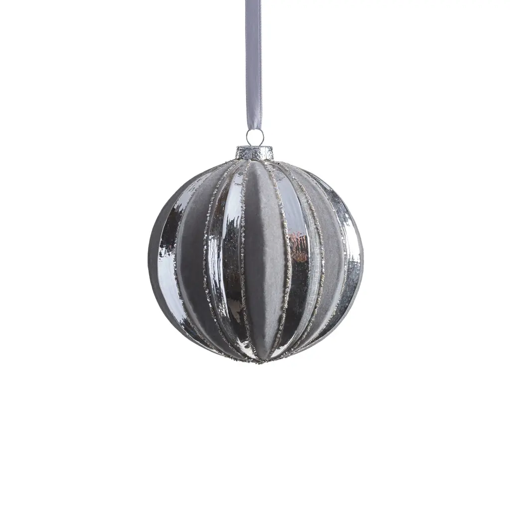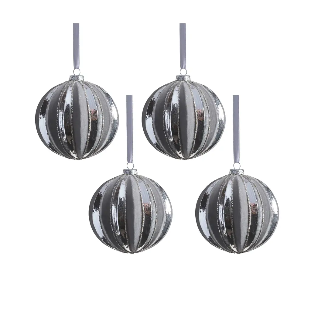 Add a touch of sophistication to your holiday décor with our Giada Shiny Glass Ball Ornaments. These stunning ornaments feature a ribbed design that alternates between a sleek shiny silver color and a soft flock light gray finish. Vertical lines of mixed glitter and tiny beads add a sparkling touch, making these ornaments a standout addition to your festive decorations. Perfect for creating a chic and elegant atmosphere, the Giada ornaments will elevate your holiday decor with their unique and refined design. Features: Set of 4 ball ornaments of the same size Ribbed design Flock and shiny finishes for sophisticated and tactile contrast Equipped with silver ornament cap Each comes with a string to make it easier to hang Perfect addition to your holiday tree decor