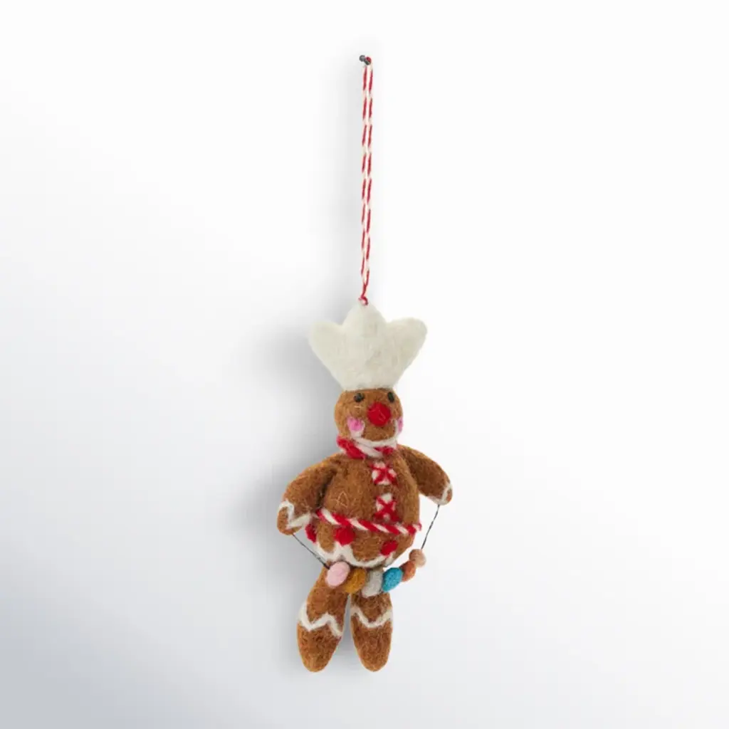 Description:Ornament is a plush ornament in the shape of a gingerbread man, made with rich brown woven linen fabric. The gingerbread man features black stitched eyes and buttons, and wears a red and cream ticking stripe scarf. Specification: