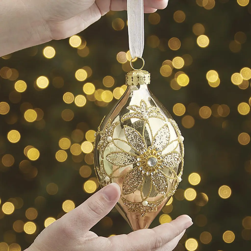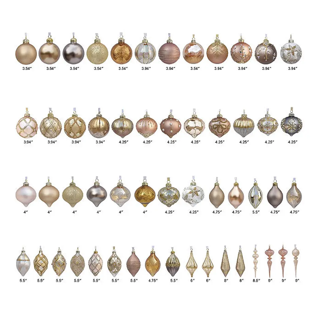 This expansive collection of handpainted blown-glass ornaments sets an elegant tone for your tree. Metallic and ivory hues produce a soft backdrop for layers of texture and detail. Faux pearls, beads, gemstones and glitter create intricate designs over a medley of finishes and shapes for a harmonious holiday display that exudes glamour and sophistication. Painted and embellished by hand 54-piece and six-piece sets 54-piece set includes a range of shapes, including ball, onion, teardrop and finial Each ornament is topped with a metal cap and ribbon for hanging Ornament length does not include ribbon; ribbon is 3"—3-1/2"L For indoor use Store in original packaging or Ornament Storage Box (sold separately) Imported A Frontgate exclusive. At Frontgate, our primary focus is quality. We guarantee that every product we sell will stand up to the supreme test – our customers' satisfaction. To learn more about our policies, visit our Shipping & Processing, Returns & Exchanges and Warranty & Price Guarantee pages. This expansive collection of handpainted blown-glass ornaments sets an elegant tone for your tree. Metallic and ivory hues produce a soft backdrop for layers of texture and detail. Faux pearls, beads, gemstones and glitter create intricate designs over a medley of finishes and shapes for a harmonious holiday display that exudes glamour and sophistication. Painted and embellished by hand 54-piece and six-piece sets 54-piece set includes a range of shapes, including ball, onion, teardrop and finial Each ornament is topped with a metal cap and ribbon for hanging Ornament length does not include ribbon; ribbon is 3"—3-1/2"L For indoor use Store in original packaging or Ornament Storage Box (sold separately) Imported A Frontgate exclusive. At Frontgate, our primary focus is quality. We guarantee that every product we sell will stand up to the supreme test – our customers' satisfaction. To learn more about our policies, visit our Shipping & Processing, Returns & Exchanges and Warranty & Price Guarantee pages.