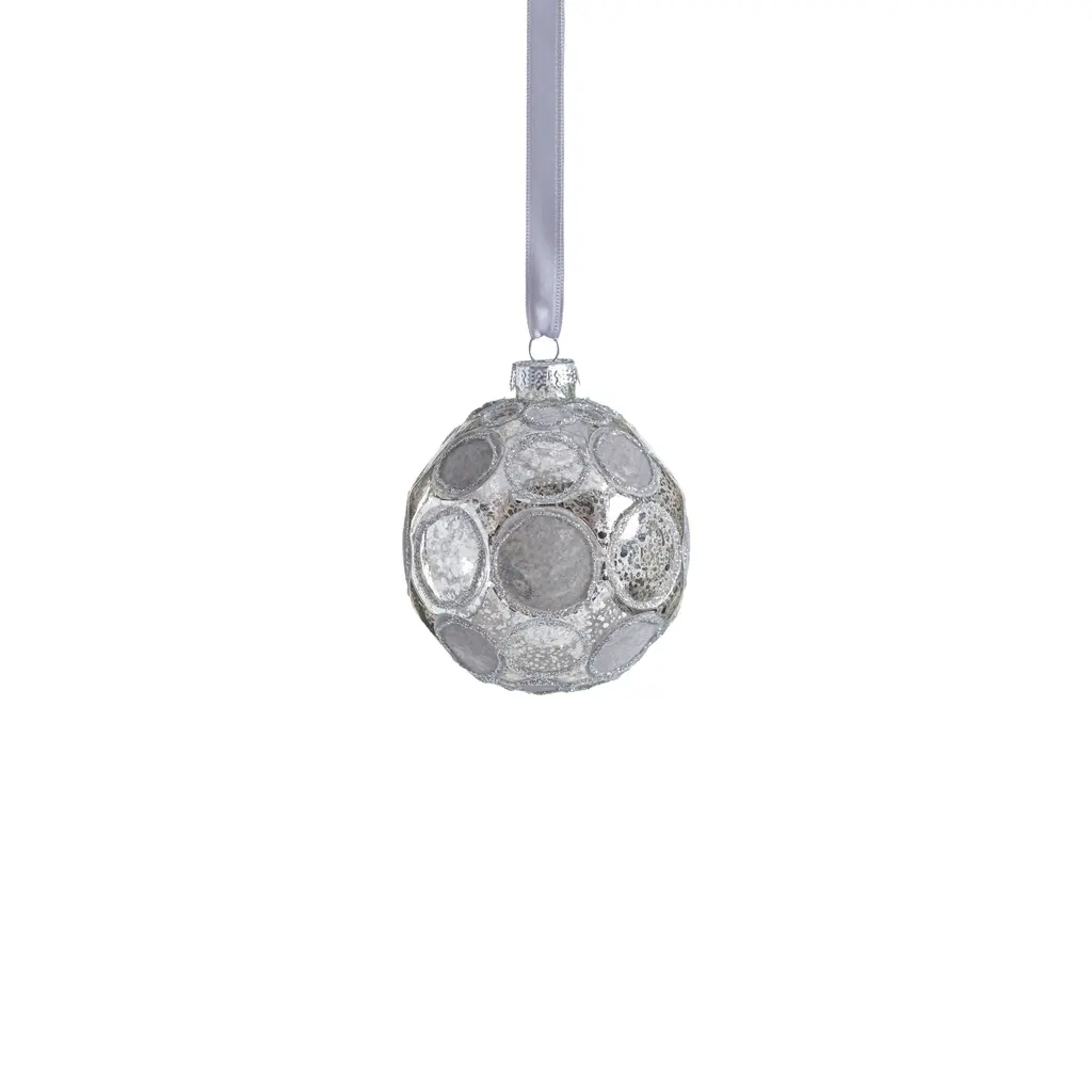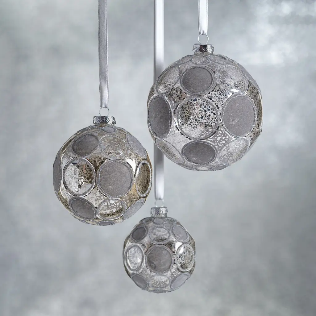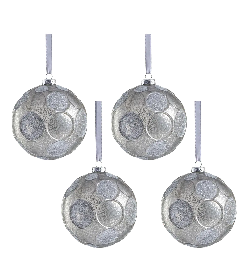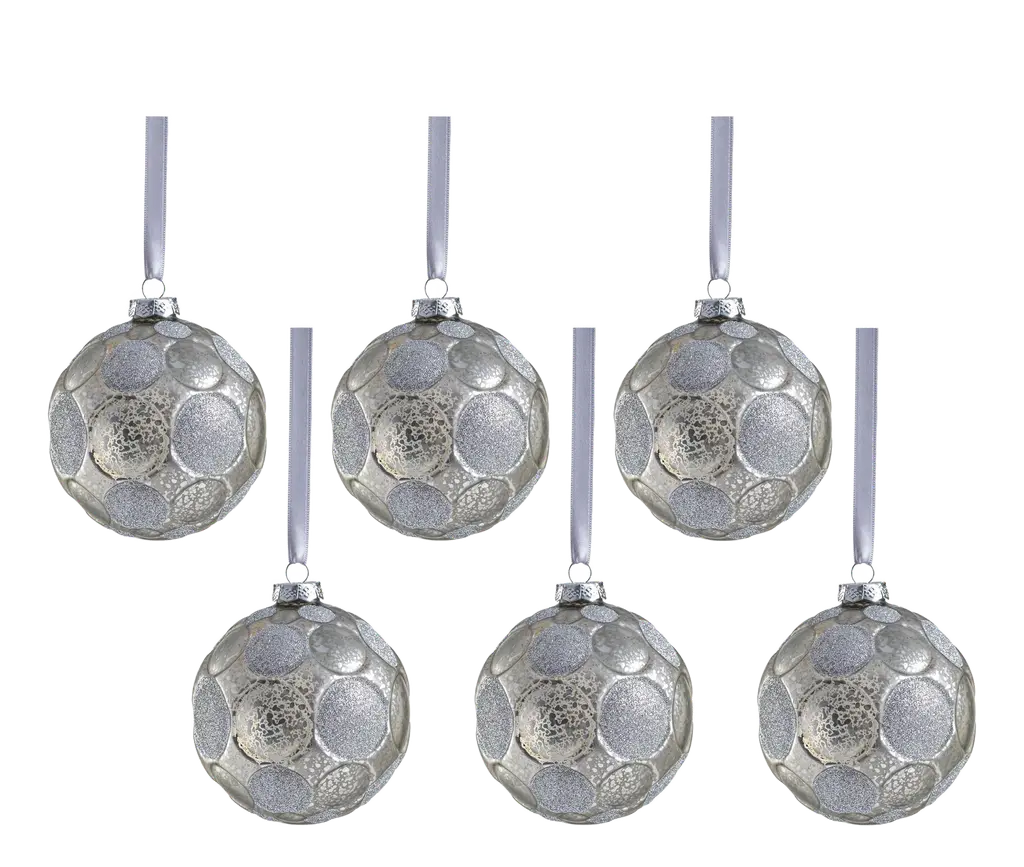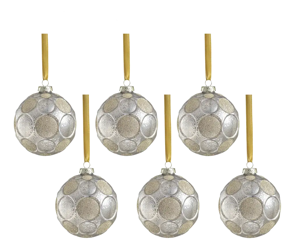 Add a touch of elegance to your holiday decor with our Gleaming Serenity Glass Ball Ornaments. These exquisite ornaments are crafted to resemble speckled glass and feature a glittered edge polka dot design, with a unique combination of finishes. Some dots boast a radiant, shiny finish that reflects light beautifully, while others are adorned with a luxurious velvet-like texture for a sophisticated contrast. Perfect for your Christmas tree or as decorative accents, these ornaments will bring a shimmering, festive charm to any setting. Features: Set of 6 hanging ornaments of the same size Glittered polka dot pattern Flock and shiny finishes for sophisticated and tactile contrast Equipped with ornament cap A fun and festive addition to any holiday décor Comes ready to hang