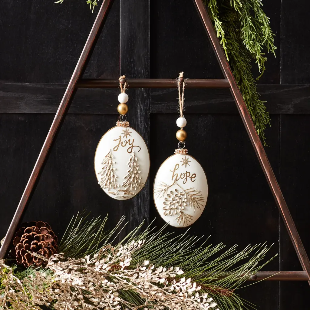 Add a traditional touch to your Christmas tree with this stunning set of Glass Pine Sentiment Ornaments. Featuring 12 pieces and two assorted designs, the wintry gold and white tones paired with the "Hope" and "Joy" sentiments and glittered pine tree and cone designs are the perfect combination to create a memorable display. The quality glass composition with beaded gold string hanger is sure to endure for seasons to come. Whether you're adding a touch of cheer to your home or gifting to a loved one, these ornaments will definitely bring holiday spirit to your home.
