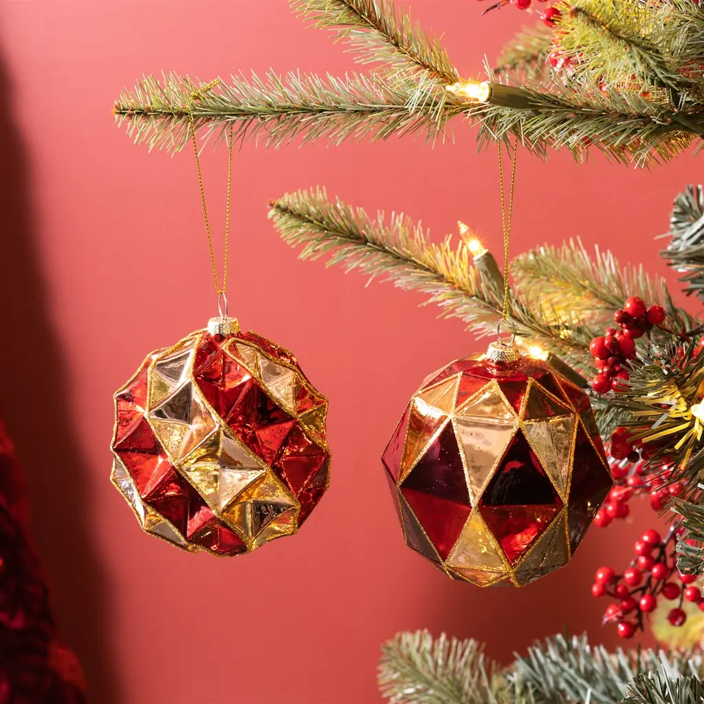 Adorn your Christmas tree with this stunning set of Glass Ball Ornaments. Featuring six pieces and two assorted designs, the chic red and gold tones paired with the harlequin design and glittered accent are perfect to create a memorable display. The quality glass composition with delicate string hanger is sure to endure for seasons to come. Whether you're adding a touch of cheer to your home or gifting to a loved one, these ornaments will definitely bring holiday spirit to your home.