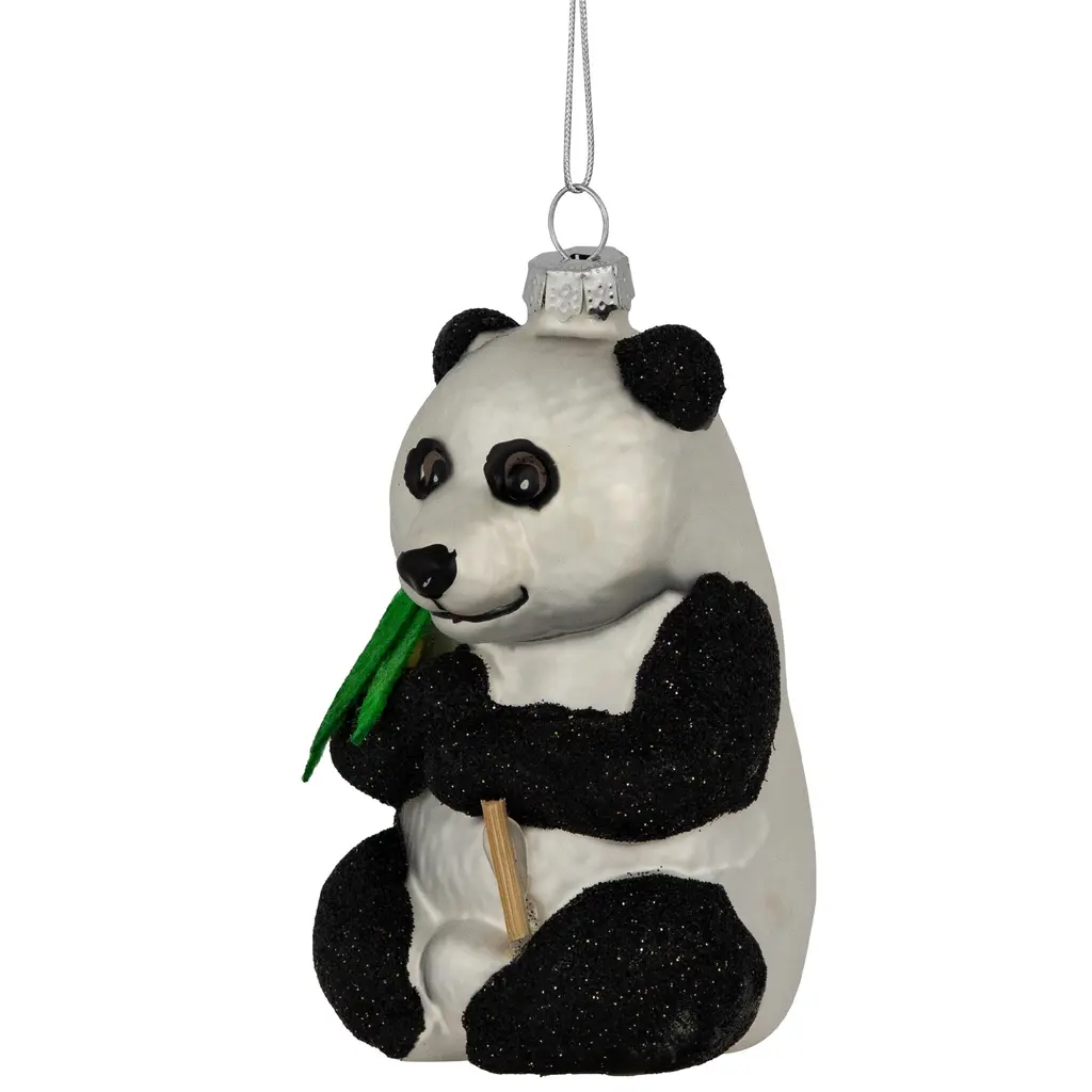 Add a touch of timeless charm to your holiday decor with this panda bear glass ornament. This adorable ornament captures the spirit of these beloved creatures in classic black and white hues. Accented with glitter, it will shine beautifully on any Christmas tree, reflecting the warm glow of Christmas lights. Whether you're an animal lover or simply appreciate the beauty of nature, this panda bear ornament is sure to bring joy and whimsy to your holiday celebrations. Product Features: Glass Christmas hanging ornament Black and white Panda holding a bamboo branch with green leaves design Matte finish accented with black glitter Fully dimensional ornament Equipped with a silver ornament cap and a silver hanging cord For indoor decorative use only Dimensions: 4"H x 2.5"W x 2.5"D Material(s): glass/felt