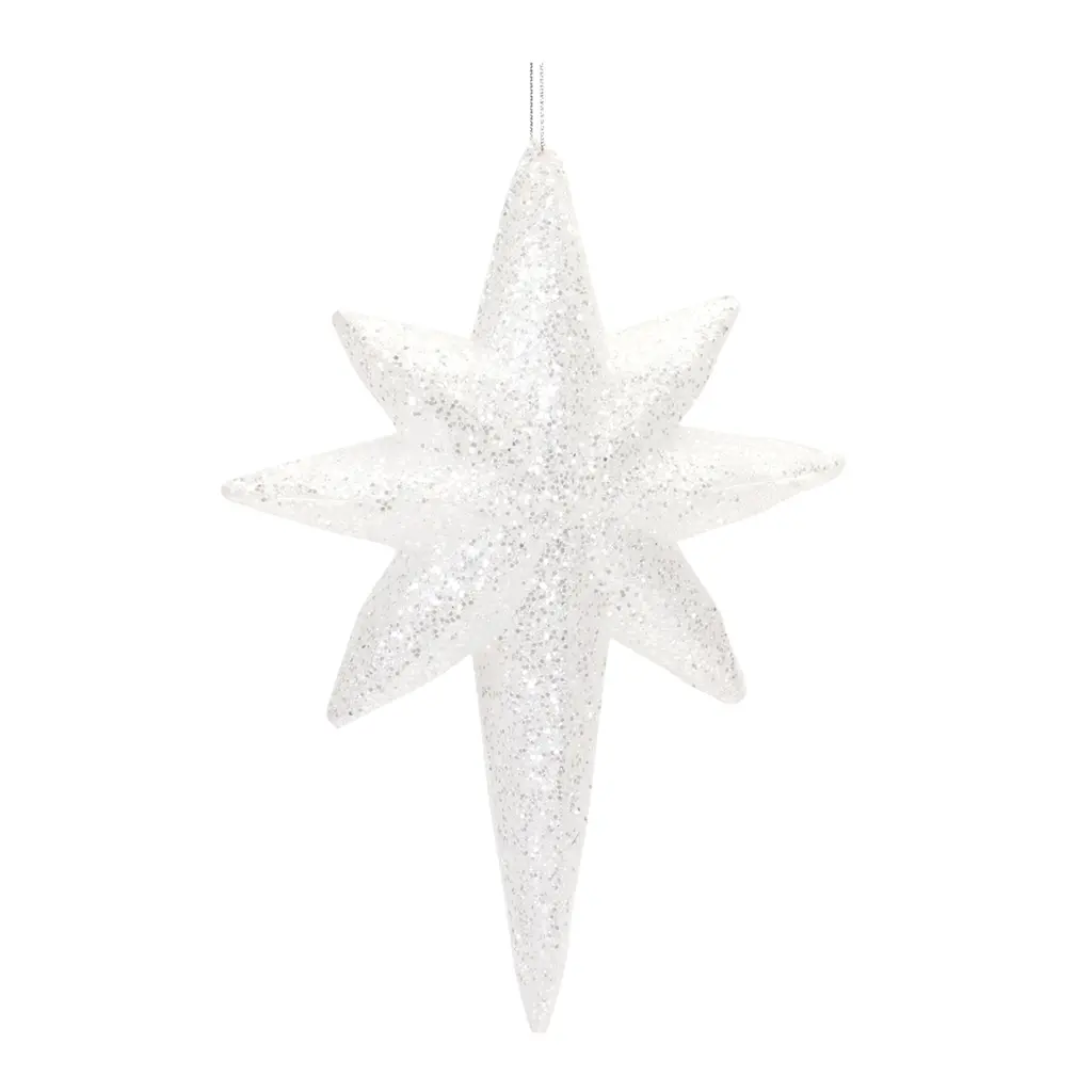 Bring an air of sophistication to your Christmas tree with this exquisite set of star ornaments. With an elegant Northern Star design adorned with subtle glitter accents, they create a captivating display. Whether you're embellishing your tree or giving them as cherished gifts, these ornaments are guaranteed to bring smiles and add a touch of charm to your holiday decor. Product Features: 12-piece set Color: silver Comes in a northern star design Accented with glitter finish Comes ready-to-hang on a silver string Perfect addition to your holiday tree decoration For indoor use only Dimensions: 8"H x 5.75"W x 1.75"D Material(s): acrylic