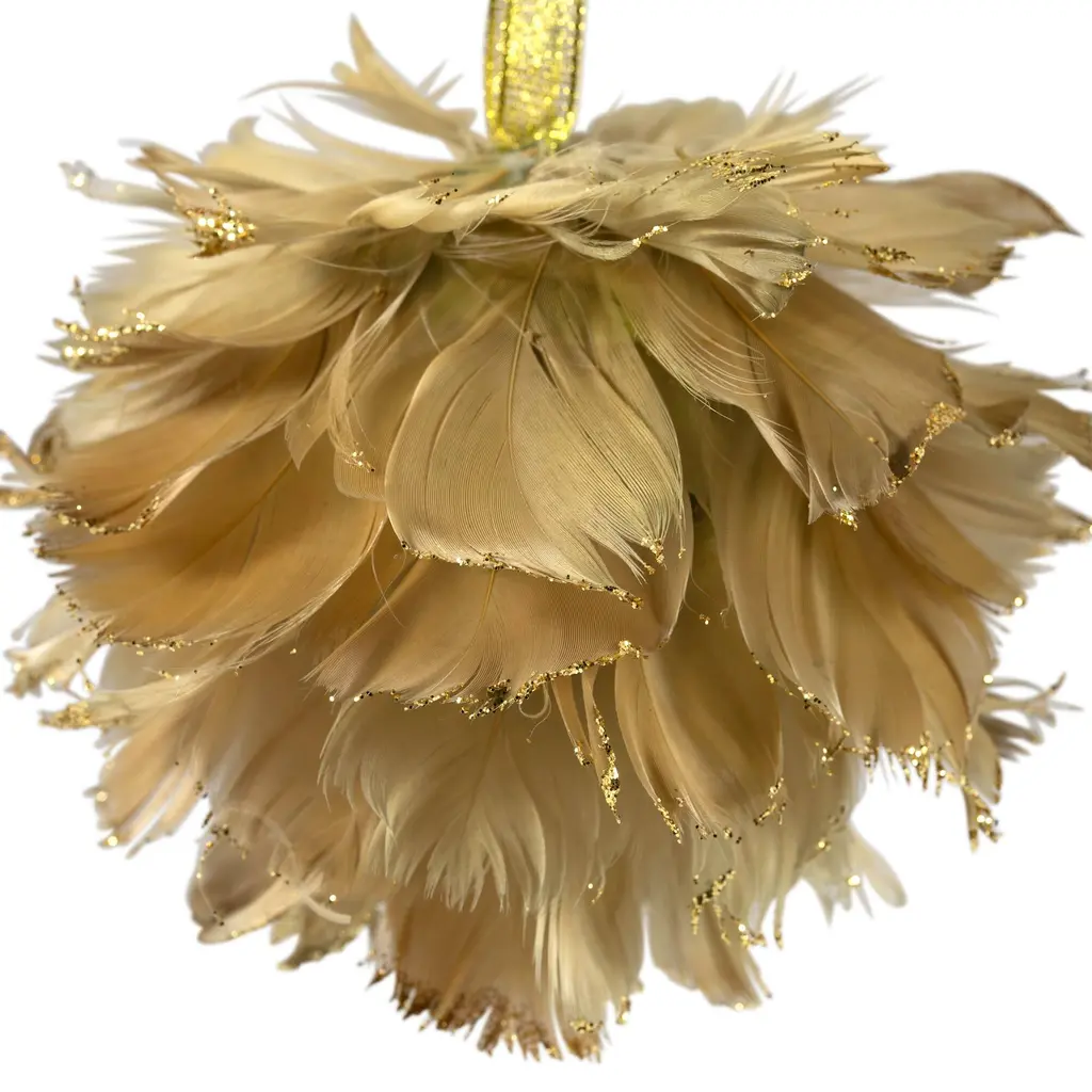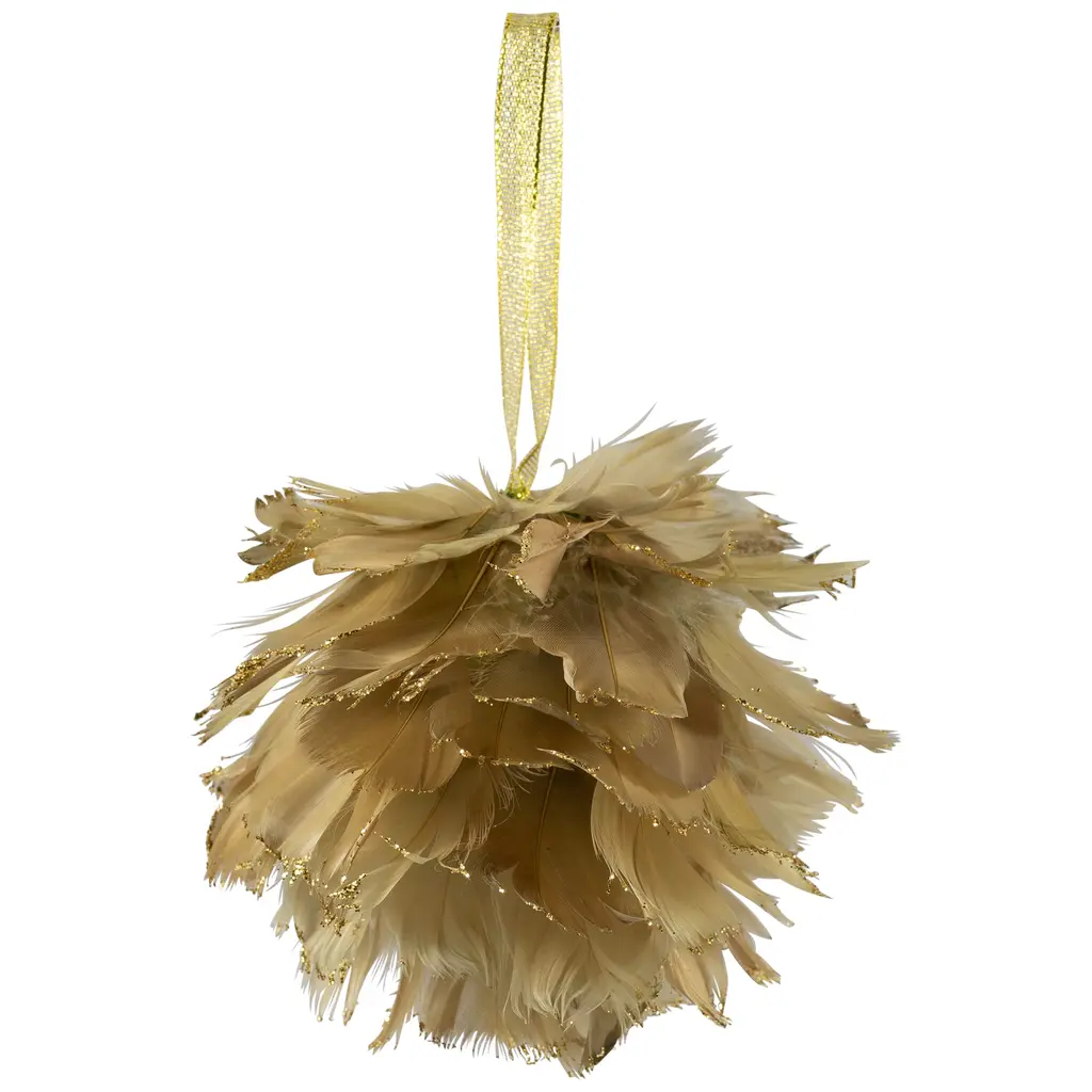 Elevate your holiday ambiance with a touch of luxury and charm with this stunning ornament. This fully-dimensional ornament is a fusion of elegance and festivity. Crafted from delicate light moss green feathers each edge glistens with radiant gold glitter casting a spell of enchantment. Ready to adorn your tree wreaths or garlands it also comes with a shimmering light moss green ribbon for effortless hanging. Product Features: Feather ball Christmas hanging ornament Composed of light miss green feathers adorned with gold glitter edges Fully dimensional ornament Comes ready to hang on a green ribbon Recommended for indoor use only Dimensions: 6" diameter Material(s): foam/feathers