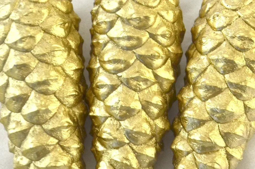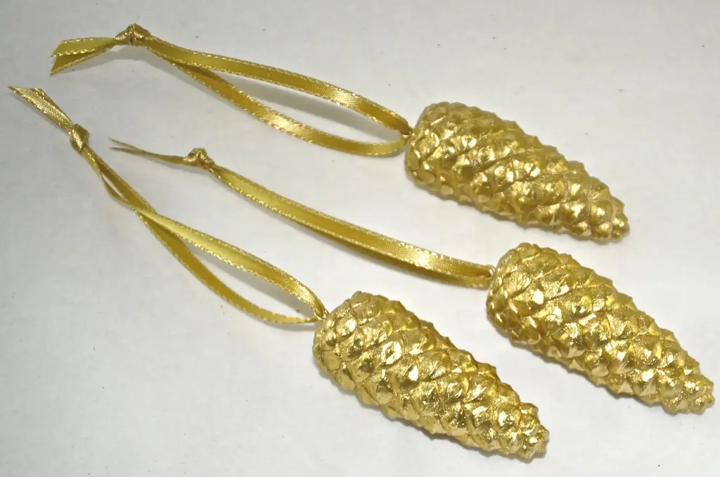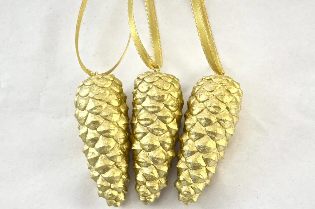 Holiday ornament set of three (3) hand-cast gold pine cone Christmas tree ornaments capture the true natural texture and shape from a pine tree cone. Each one is strung on fresh gold sateen ribbon.
