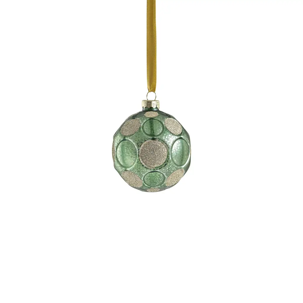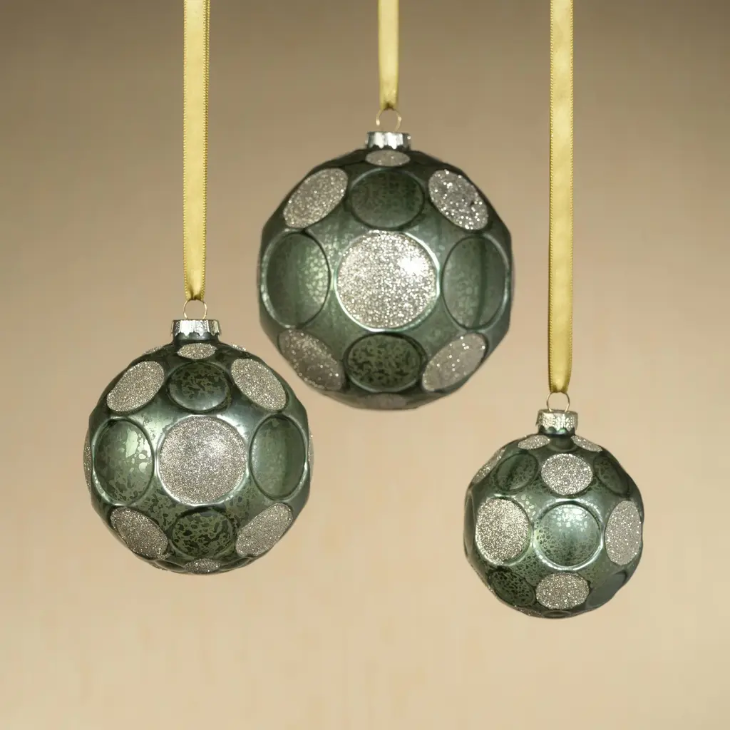 Add a touch of whimsy and elegance to your holiday decor with the Matte Frosted Serenity Glass Ball Ornaments. These enchanting ornaments are crafted to resemble speckled glass and feature a delightful polka dot design, where some dots boast a chic matte frosted finish while others sparkle with glitter. This captivating contrast creates a playful yet sophisticated look that adds depth and interest to your festive decorations. Perfect for adorning your Christmas tree or garland, these ornaments bring a unique blend of charm and glamour to your seasonal celebrations. Fun polka dot pattern. Set of 6 hanging ornaments of the same size. Matte frosted finish with glitters. Equipped with ornament cap A fun and festive addition to any holiday décor. Comes ready to hang. Clean with a soft dry cloth.