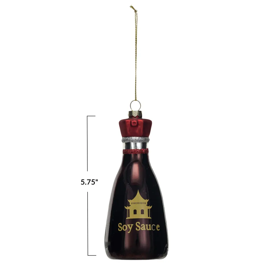 A hand-painted glass "Soy Sauce" bottle ornament, sparkling with glitter and a rich multicolor paletteFeatures: