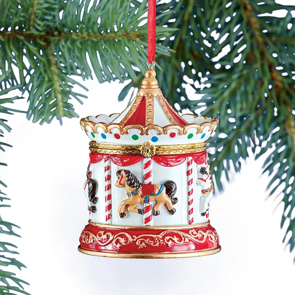 These detailed trinket boxes are the perfect way to give a gift to someone you love. The hand-painted ornaments make a festive addition to your tree choose the bell, cardinal, carousel, dove, gnome or Santa. Each has a ribbon for easy hanging and a clasp for easy opening. Resin and brass. Each approx. 3"L x 2"W x 3 1/2"H. Choose: Bell, Santa, Dove, Cardinal, Carousel or Gnome. Sold individually.