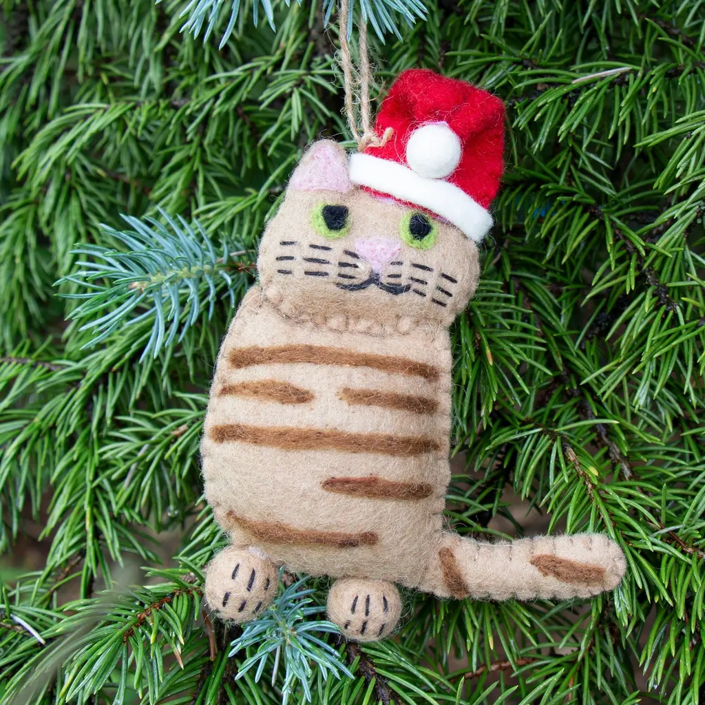 Handmade Felt Ginger Tabby Santa Cat Felt Ornament - Multi - Wool