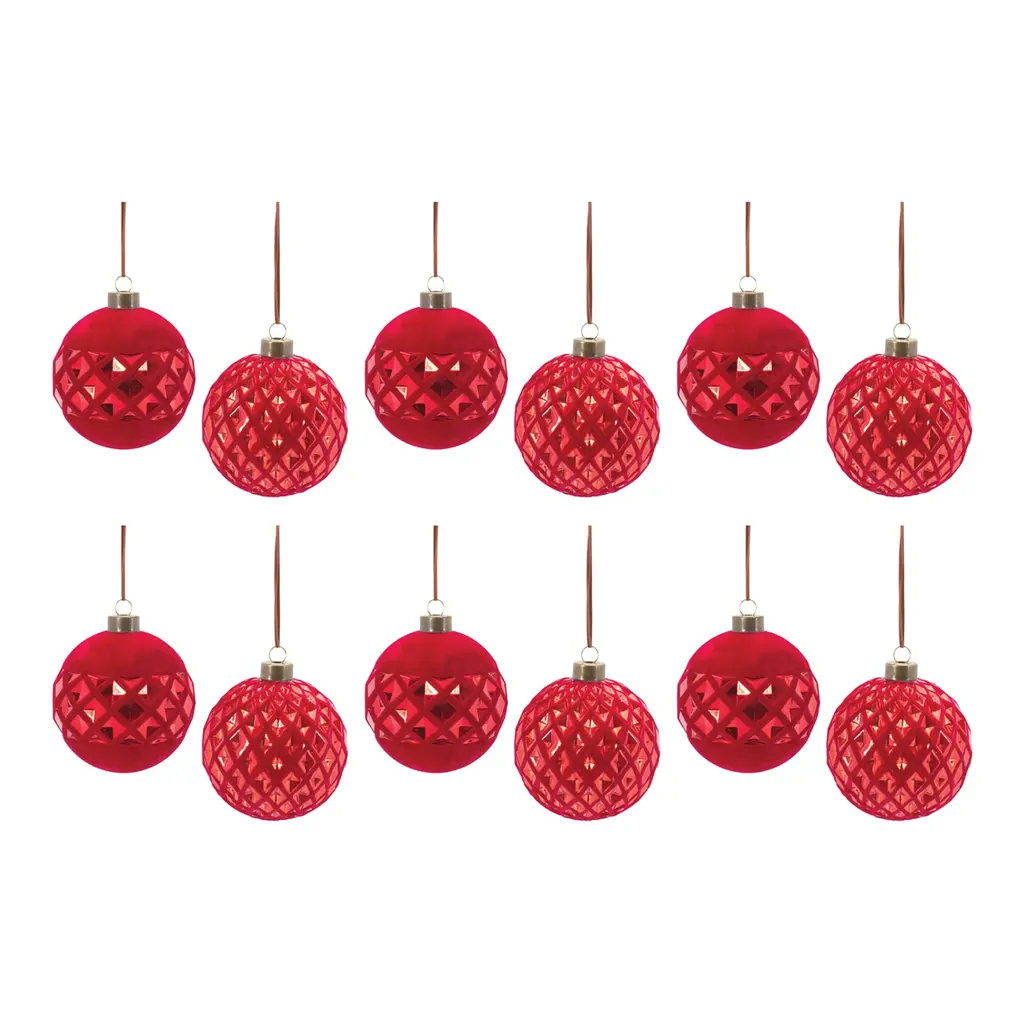 Specification:Description: Adorn your Christmas tree and holiday decor with this stunning set of Harlequin Glass Ball Ornament. Featuring 12 pieces, the festive red tones paired with the textured design is the perfect combination to create a memorable display. The quality glass composition and delicate cord string hanging accent is sure to endure for seasons to come. Whether you're adding a touch of cheer to your home or gifting to a loved one, these ornaments will definitely bring smiles.