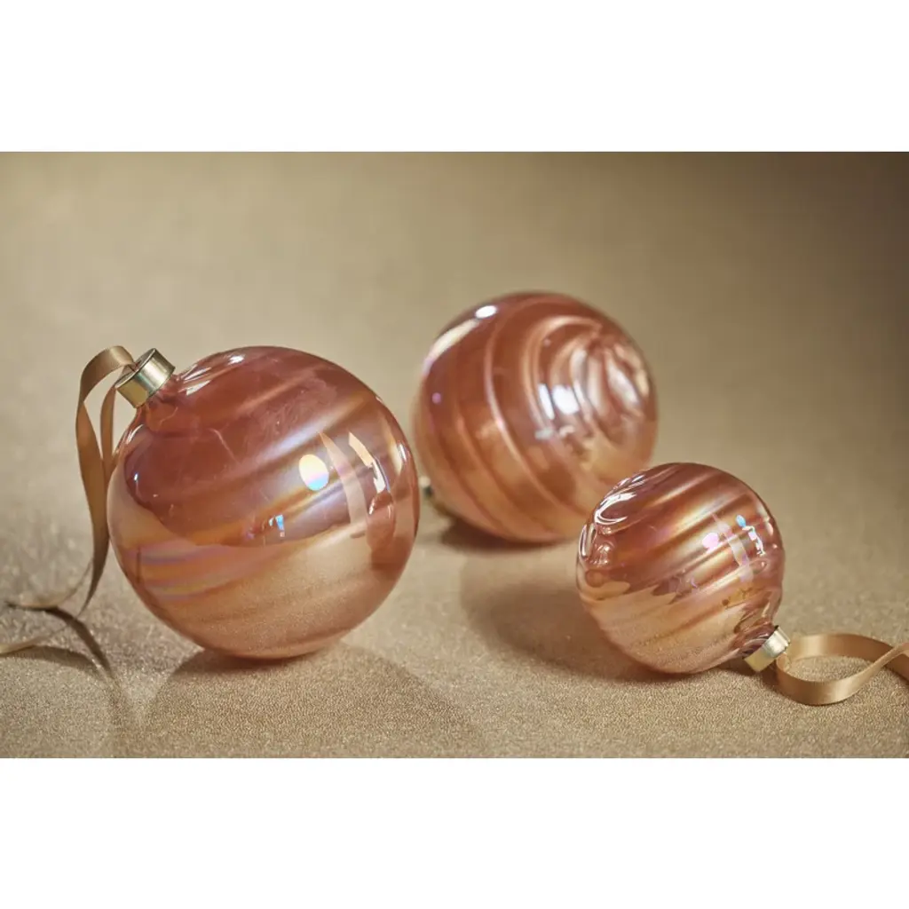 This elegant set is amazing for any holiday décor. The pearl luster finish gives the ornaments a soft, pearly sheen which enhances the color of the piece. The swirl design adds an artistic and whimsical touch to the ornaments, evoking a sense of movement and fluidity. The combination of the swirl patterns and the luster finish makes these glass ball ornaments truly unique and visually captivating. A metal cap with ring is attached to each round glass decoration for easy hanging on trees, garlands, and wire.