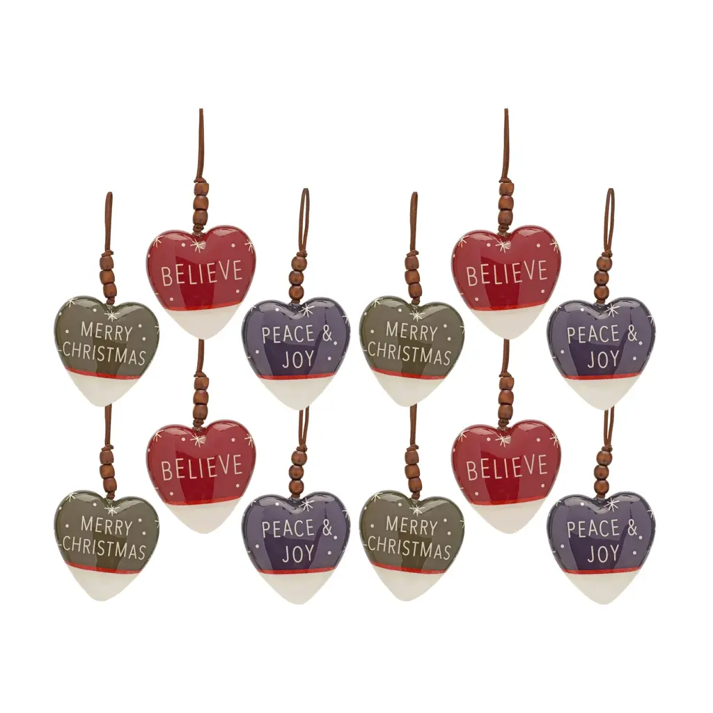 Adorn your Christmas Tree with this beautiful set of Heart Sentiment Ornaments. Featuring three assorted designs, the sentiments include "Merry Christmas", "Believe", and "Peace & Joy". The warm red, green, and navy tones paired with the bead accents makes this set the perfect additiont to your holiday tree decor. The pieces can be used as gifts for friends to cherish, or you can display the set on your own Christmas tree and enjoy them for years to come. Featured in Melrose International's home and holiday collection.