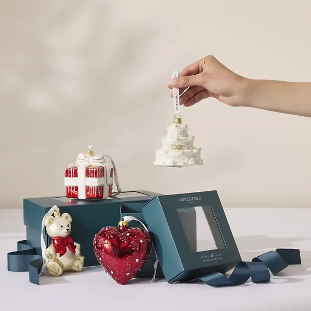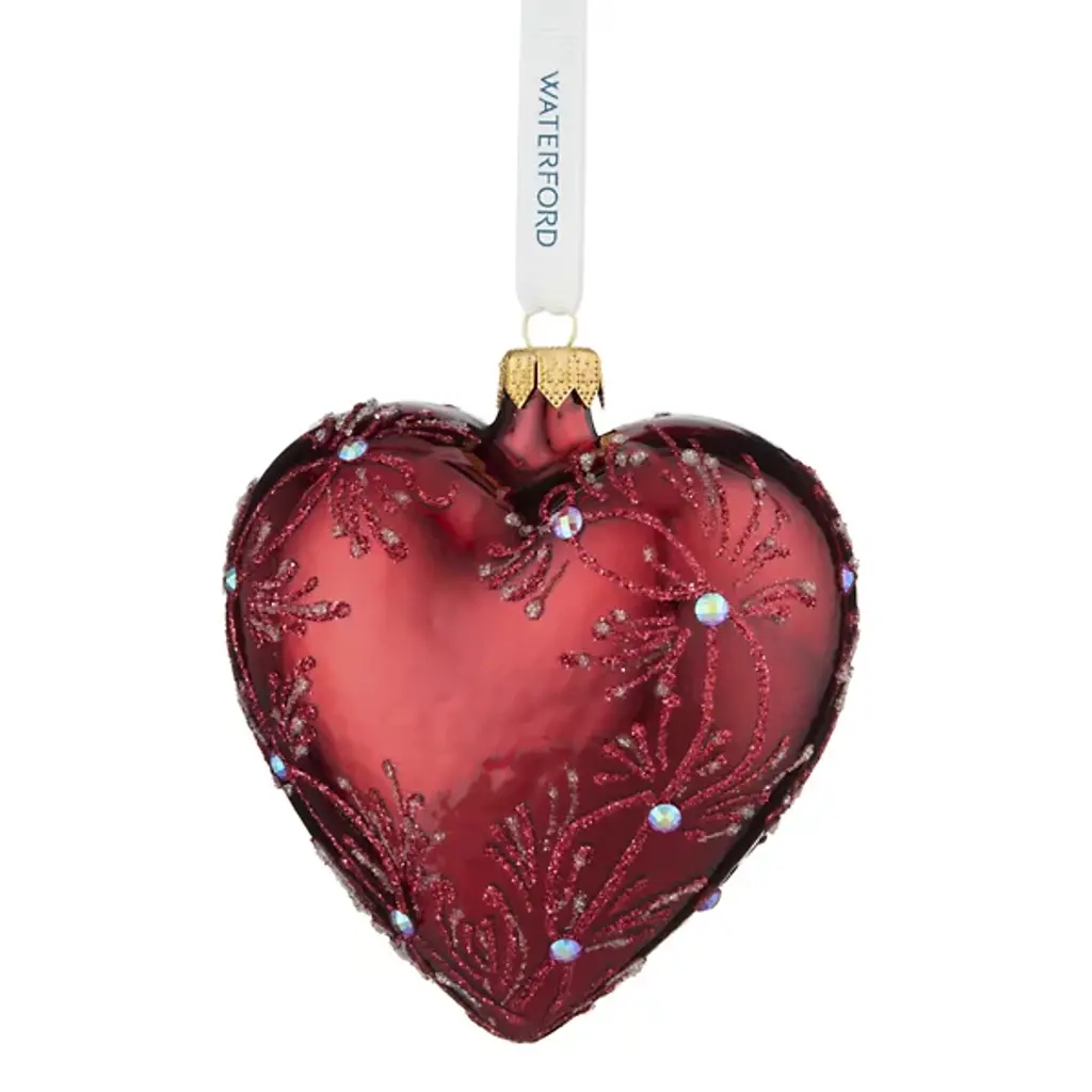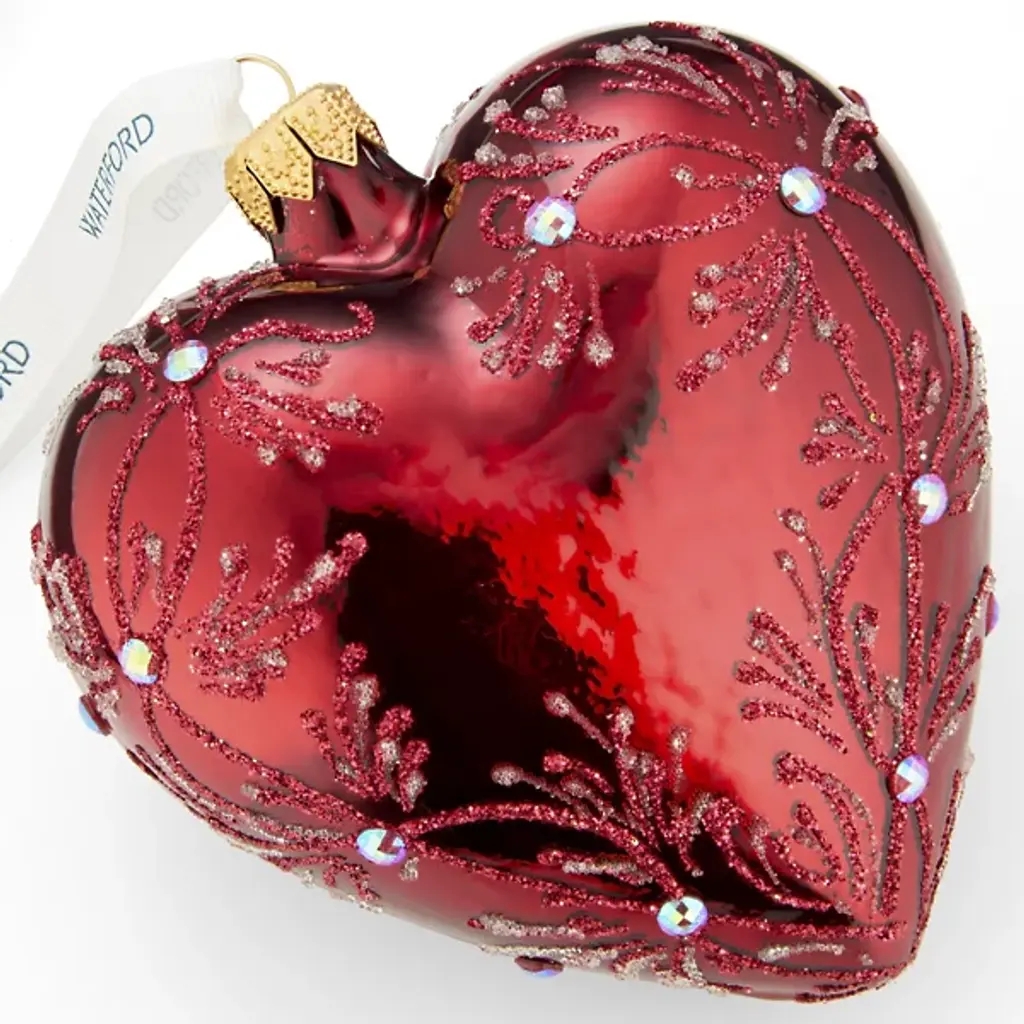 The Holiday Heirlooms Heart Ornament from Waterford features a dimensional heart silhouette that creates visual depth through its curved surface geometry. European artisans handcraft each piece using traditional glassmaking techniques, applying shimmering glitter details that catch and reflect light from multiple angles. The heart form provides a symbolic representation of festive sentiments through its recognizable shape and proportions. Each ornament receives individual attention during the crafting process, ensuring unique variations in the decorative application.
