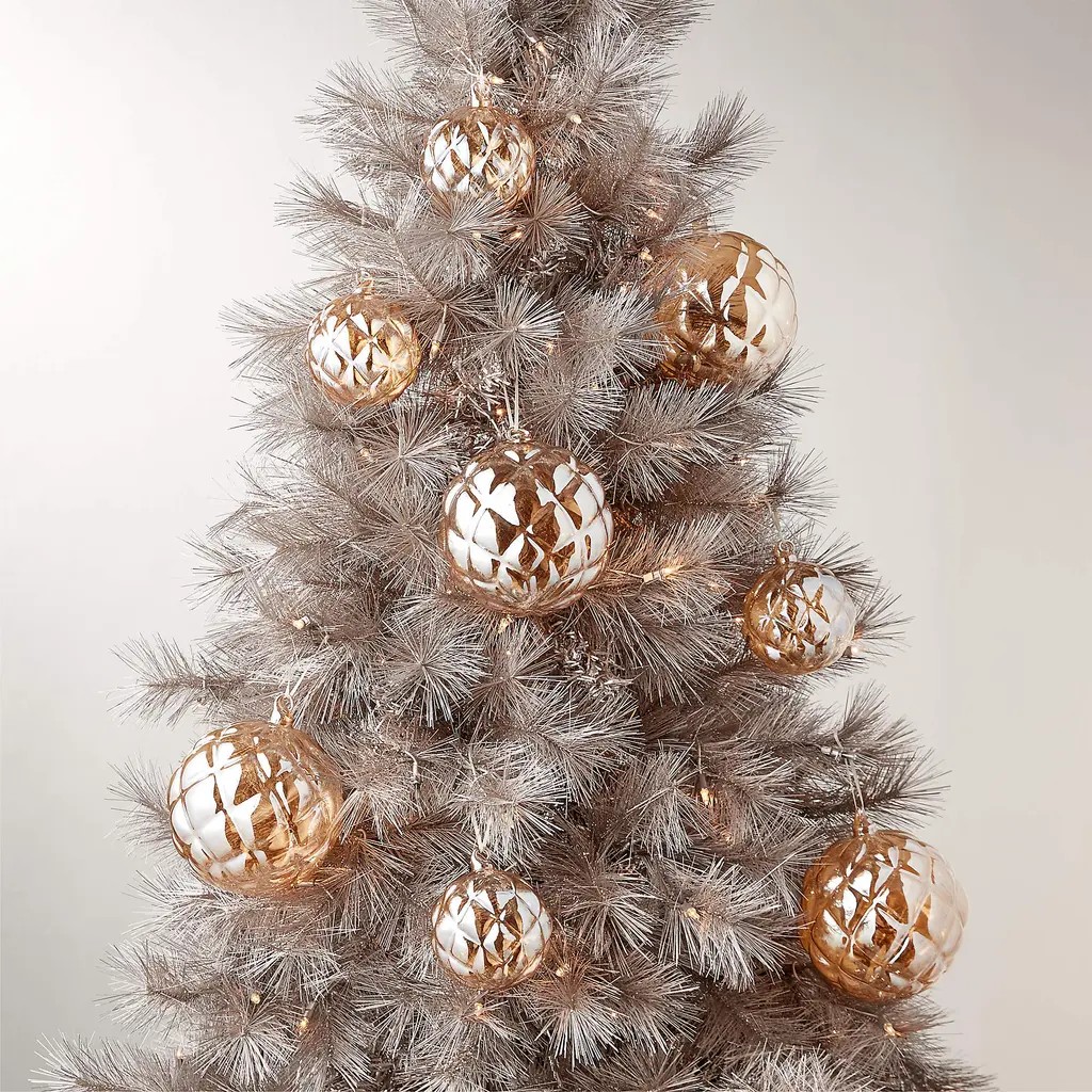 A warm interpretation of the holidays, amber glass ball ornament is aglow with diamond-shaped facets. Set of eight includes four small and four large ornaments. CB2 exclusive.