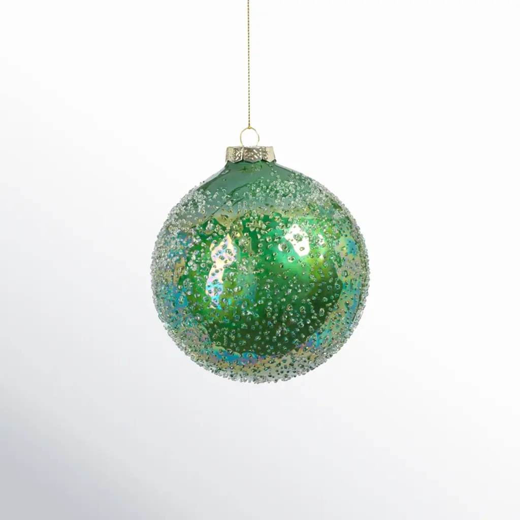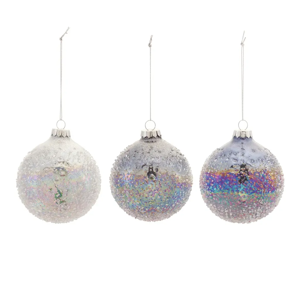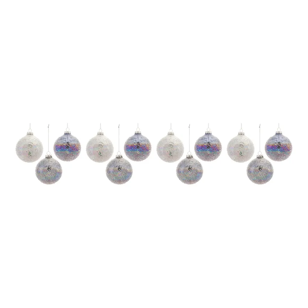 Adorn your Christmas tree and holiday decor with this stunning set of Irredescent Glass Ball Ornaments. Featuring 12 pieces, the chic silver and the wintry blue and white tones paired with the irredescent design is the perfect combination to create a memorable display. The quality glass composition and delicate silver string hanging accent is sure to endure for seasons to come. Whether you're adding a touch of cheer to your home or gifting to a loved one, these ornaments will definitely bring smiles.