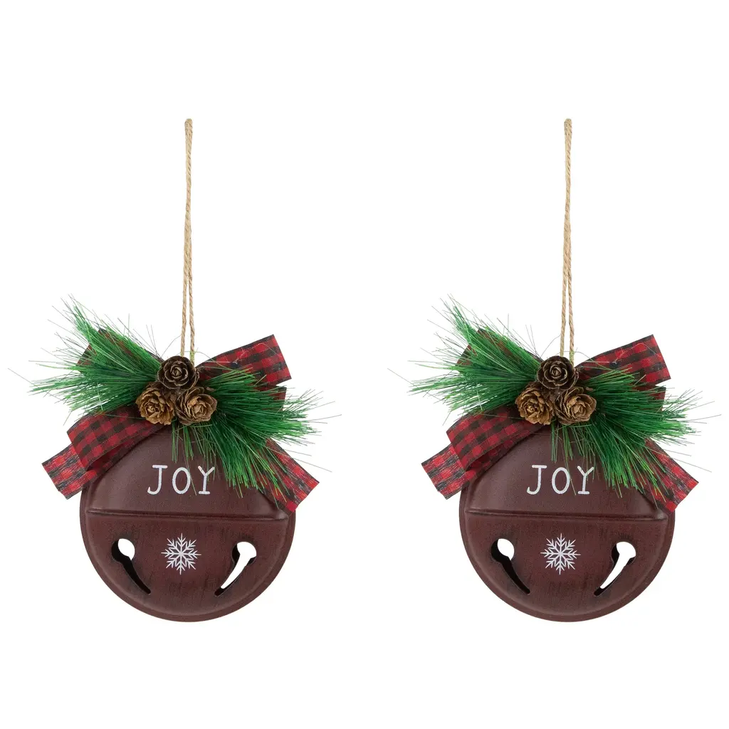 Enhance your holiday ambiance with these charming jingle bell ornaments with the message "Joy" and adorned with a white snowflake. Complete with pine needles, pinecones, and a delightful plaid bow, these accents evoke a festive spirit in your home. Perfect for adorning your Christmas tree, door handles, or mantel, they bring a traditional touch to your decor. Embrace the season with these elegant and timeless decorations. Features: Set of 2 Christmas jingle bell disc ornaments Joy sentiment Accented with pine sprigs, pinecones, and a plaid bow Each decoration comes ready-to-hang on a jute cord Indoor use recommended Dimensions: 5"H x 5"W x 1"D With cord: 8" Material(s): metal/jute/plastic/fabric