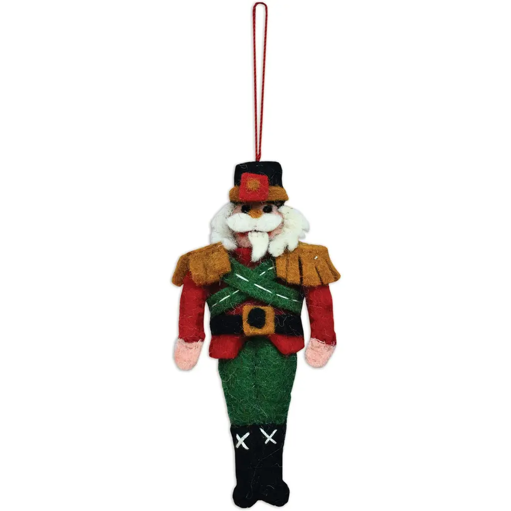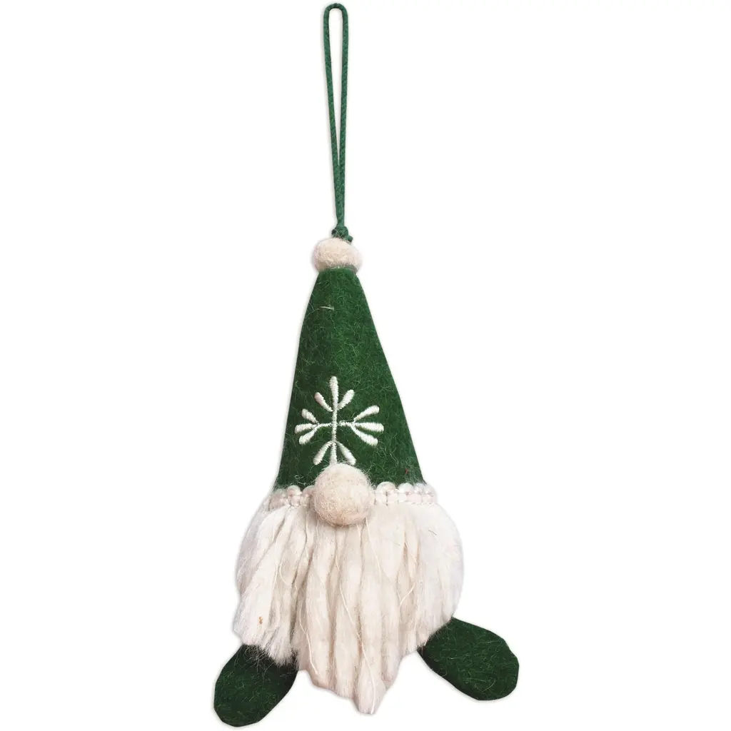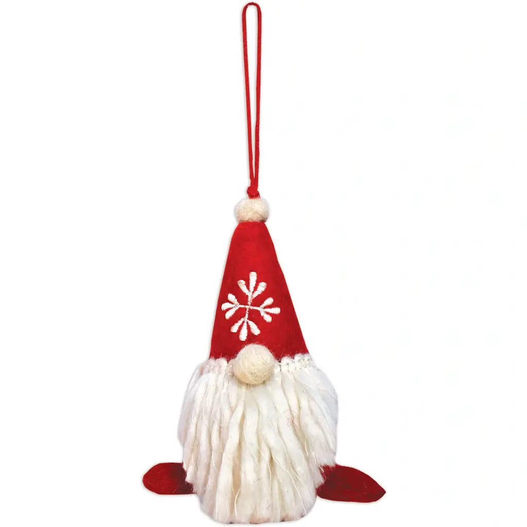 Description :This is a felt gnome plush with a festive Santa design. Gnome wears a long red hat with gold embroidery and a gold jingle bell pom pom. He has a long white beard and a wooden nose and he comes ready to hang by a red and white string hanger. Specification :