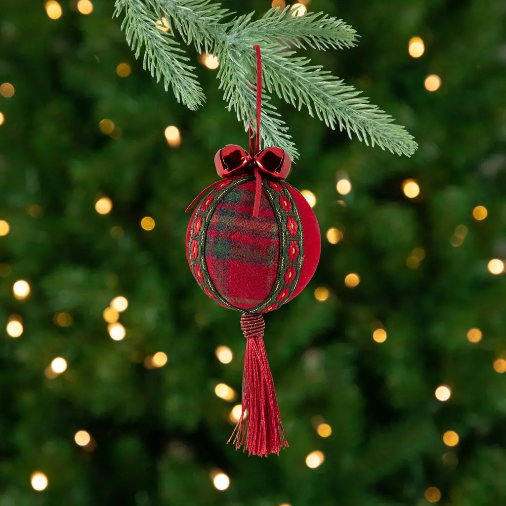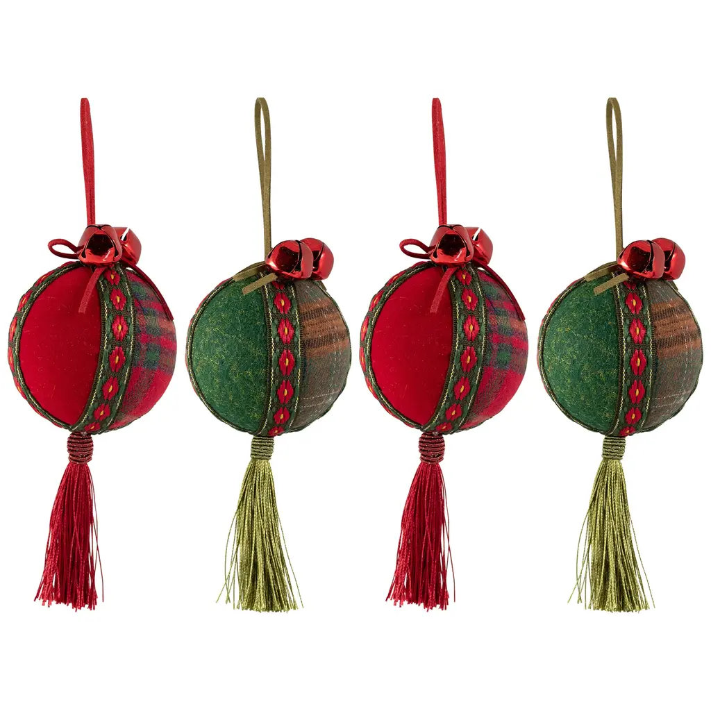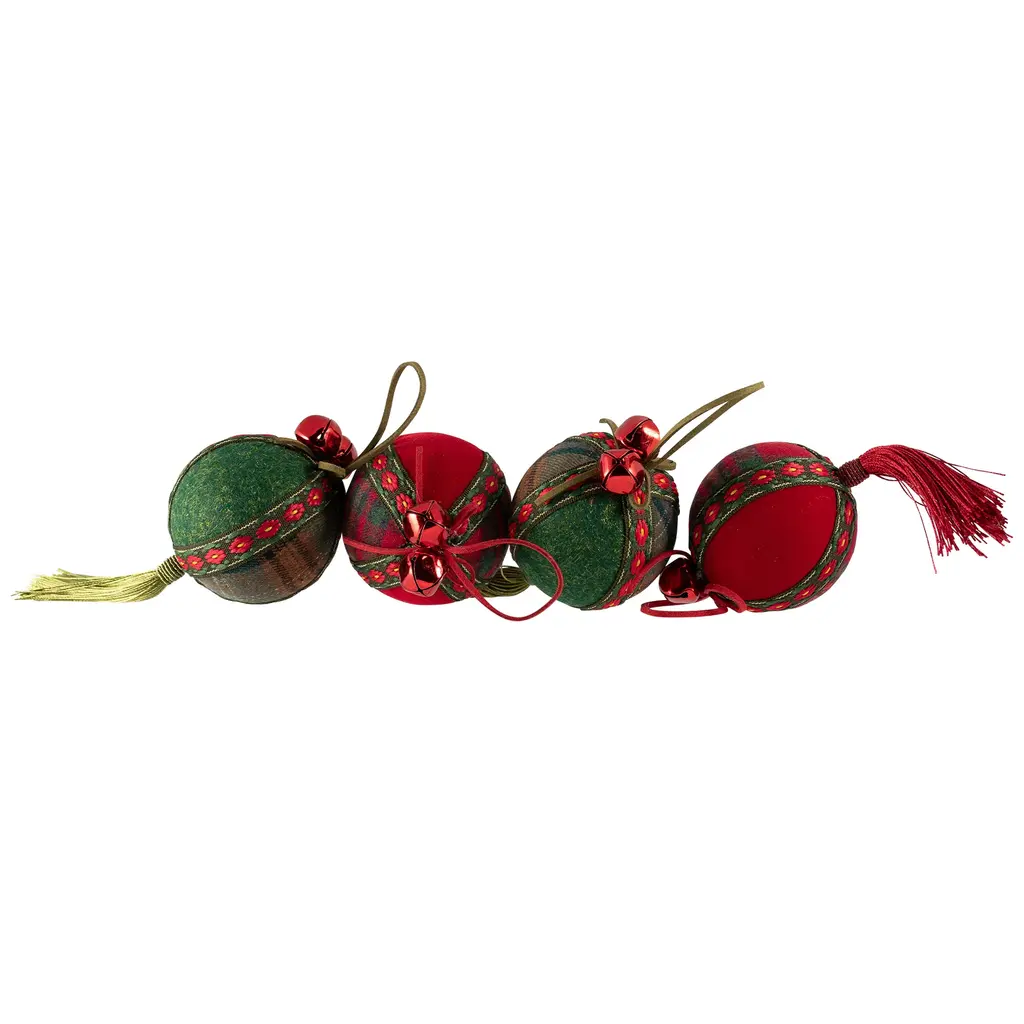Deck the halls with festive charm using these Christmas ball ornaments! This set of four ornaments boasts a delightful combination of smooth and fuzzy fabric and is adorned with ribbon trims accented with stitched flowers for an extra touch of elegance. Accented with metal red jingle bells and coordinating tassels these ornaments come ready to hang on red and green faux leather strings. Perfect for adding a pop of holiday cheer to your Christmas tree wreaths or garlands these ornaments are sure to make your season merry and bright! Product Features: Set of 4 Christmas ball ornaments Wrapped in a combination of smooth plaid with ribbon trims adorned with stitched flowers Accented with working metal red jingle bells and coordinating tassels Come ready to hang on red and green faux leather cords Recommended for indoor use only Dimensions: 2.75" diameter Material(s): fabric/foam/metal