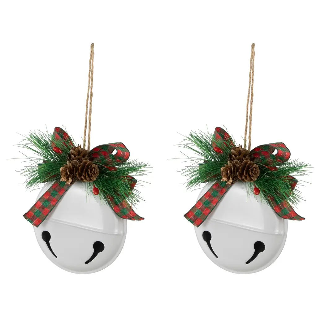 These white jingle bell ornaments provide the perfect amount of sparkle and shine to your holiday tree. Designed with pine needles mini pinecones tiny red pip berries and a plaid bow for a joyous addition to Christmas trees. Also great for decorating your mantel or in a centerpiece they provide a traditional vibe wherever they are displayed. Embrace the season with these jingle bells ornaments. Features: Christmas jingle bells ornaments Shiny white finish embellished with a red and green plaid bow Pine needles berries and pinecones Ready to hang from a jute rope Disc ornaments For indoor use only Dimensions: 5"H x 3.5"W x 1"D With jute rope 8.5" high Material(s): metal/jute/plastic/fabric