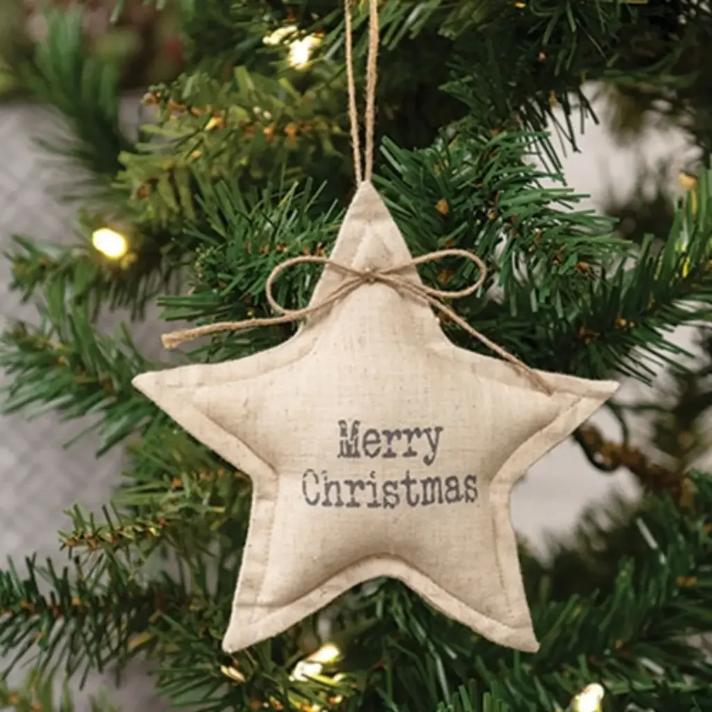 Description :One ornament is stitched into the shape of a star and displays a cream linen patch reading “Joy” in black script. The second ornament is stitched into the shape of an evergreen tree and displays a cream linen patch reading “Peace” in black script. Both ornaments include a jute rope loop at the top to use for a hanging display on a Christmas tree or other area of the home during the holiday season. Specification: