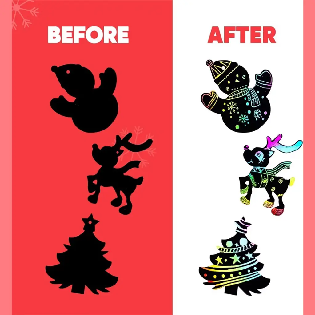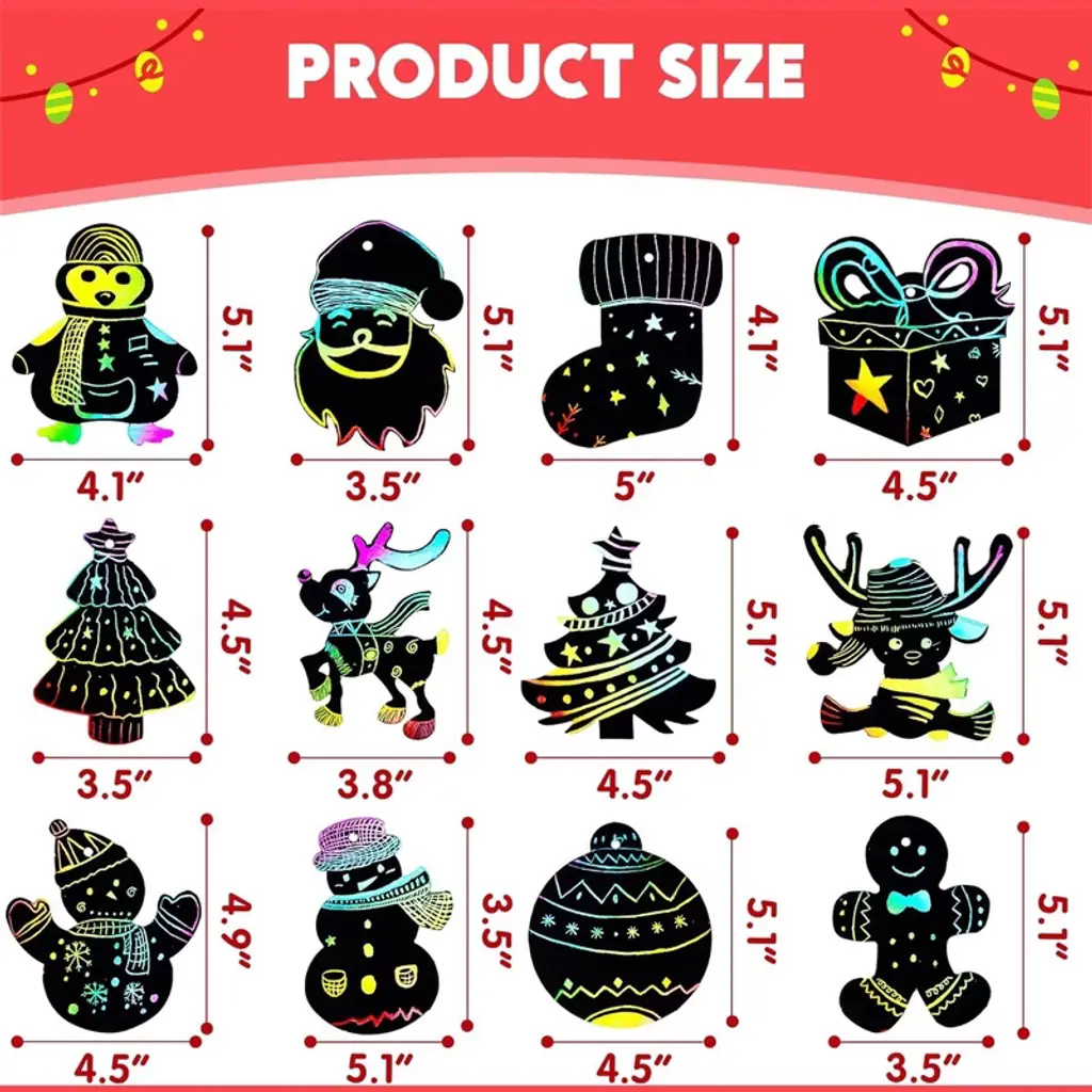 Create magical rainbow ornaments with special scratch art set, Variety ornaments kits for kids.Package included: 72 scratch paper(6 pcs for 12 patterns), 72 red cords, and 24 drawing sticks. Perfect as Christmas party favors, treasure hunt prizes, or DIY tree decorations that add a personalized touch to your holiday celebrations.