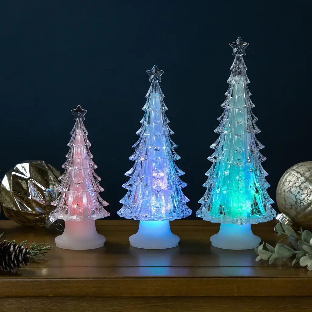 Add a touch of holiday magic to your home with this set of pre-lit tabletop Christmas trees. These enchanting battery-operated trees are the perfect addition to your holiday decor. Each tree features a mesmerizing color-changing LED light, creating a captivating display that will fill your home with holiday cheer. With their compact size and battery-powered design, you can place these trees anywhere - from your mantel to your dining table to instantly transform any space into a winter wonderland. Celebrate the season in style with these magical tabletop decorations. Product Features: LED lighted Christmas trees Pre-lit with a color changing LED light Light colors: red, blue, green, purple, white Requires 3 LR44 button cell batteries - included On/off switch located on the bottom For indoor use only Dimensions: Small tree: 6" high x 2.5" diameter Medium tree: 7.5" high x 3" diameter Large tree: 8.5" high x 3.25" diameter Material(s): acrylic Note:Set of 3 includes 1 of each item shown