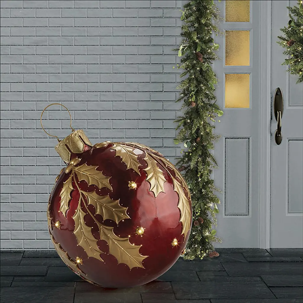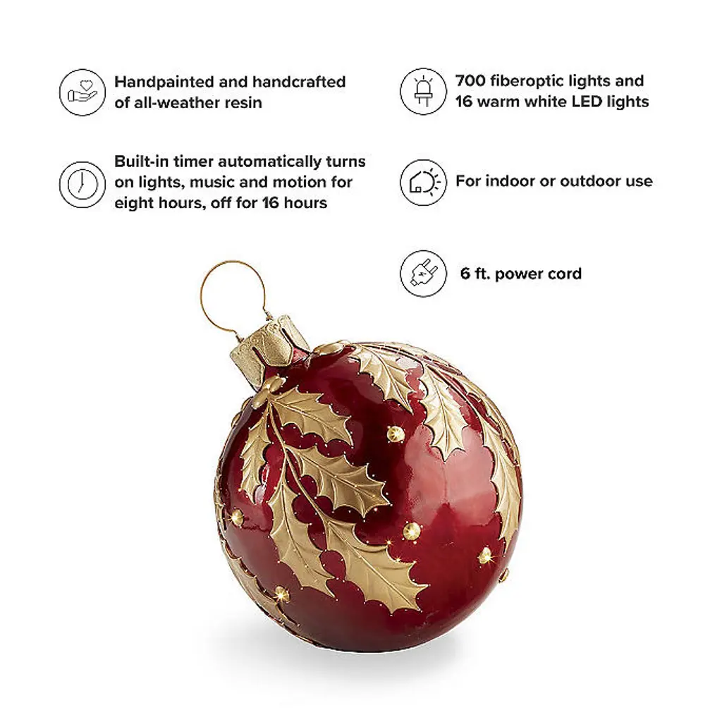 This larger-than-life handpainted ornament is sure to dazzle passersby day or night. Crafted of all-weather resin and adorned with over 700 fiberoptic and LED lights, this festive ornament can be displayed by itself or grouped with other lawn displays for maximum impact. Handpainted and handcrafted of all-weather resin 700 fiberoptic lights and 16 warm white LED lights Built-in timer automatically turns on lights for 8 hours, off for 16 hours 6 ft. cord Includes one yard stake For indoor or outdoor use Assembly instructions for Burgundy Ornament Assembly instructions for Gold Ornament At Frontgate, our primary focus is quality. We guarantee that every product we sell will stand up to the supreme test – our customers' satisfaction. To learn more about our policies, visit our Shipping & Processing, Returns & Exchanges and Warranty & Price Guarantee pages. This larger-than-life handpainted ornament is sure to dazzle passersby day or night. Crafted of all-weather resin and adorned with over 700 fiberoptic and LED lights, this festive ornament can be displayed by itself or grouped with other lawn displays for maximum impact. Handpainted and handcrafted of all-weather resin 700 fiberoptic lights and 16 warm white LED lights Built-in timer automatically turns on lights for 8 hours, off for 16 hours 6 ft. cord Includes one yard stake For indoor or outdoor use Assembly instructions for Burgundy Ornament Assembly instructions for Gold Ornament At Frontgate, our primary focus is quality. We guarantee that every product we sell will stand up to the supreme test – our customers' satisfaction. To learn more about our policies, visit our Shipping & Processing, Returns & Exchanges and Warranty & Price Guarantee pages.