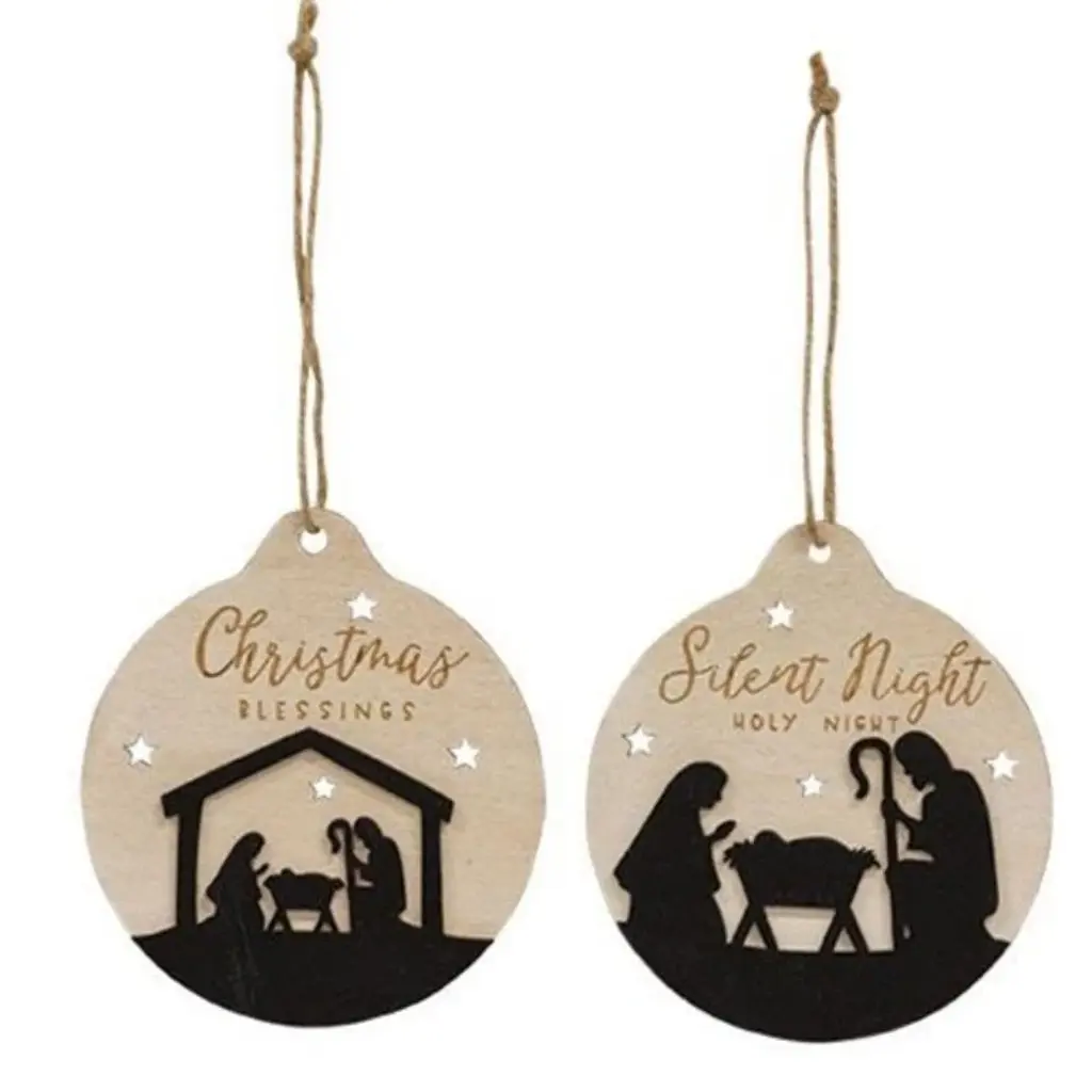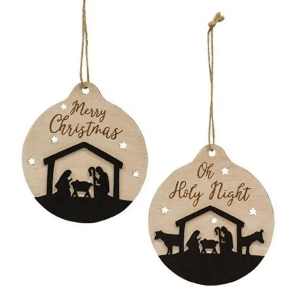 This Let Us Adore Him Tag Ornaments are an assortment of two wooden cutout ornaments in rectangular tag shapes. The ornaments each feature a black nativity scene silhouette, star cutouts, and scripted letters reading “Oh come let us adore Him” or “Glory to the newborn King”. The ornaments come with jute rope loops to use for a hanging display on a Christmas tree branch during the holiday season, for a rustic and inspirational addition to the home. Specifications :