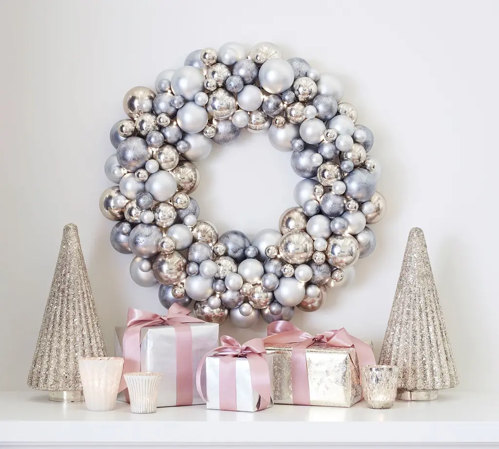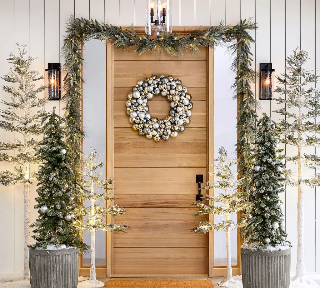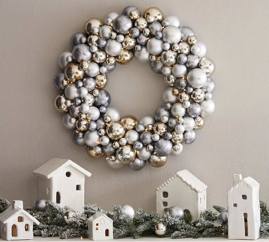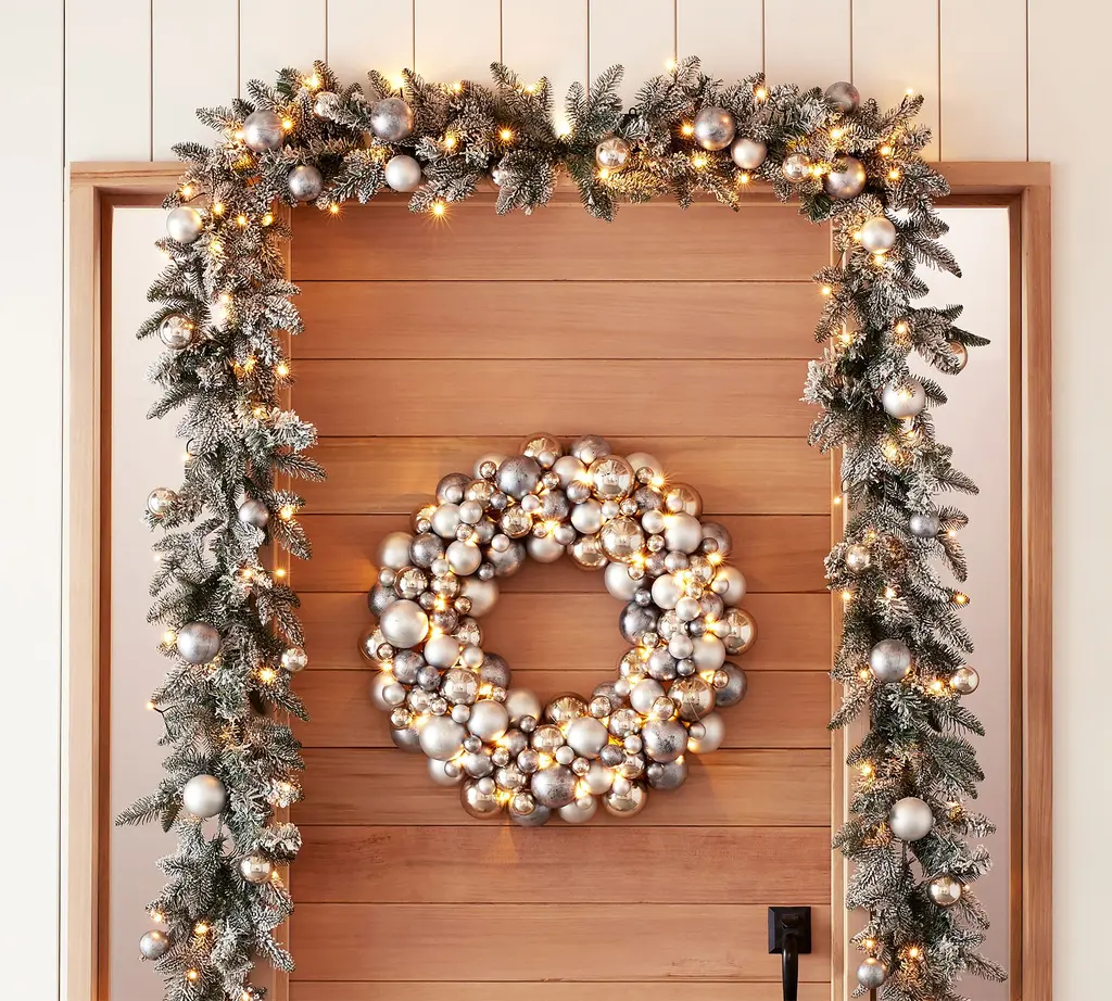 Bejeweled with silver baubles and illuminated with soft white lights, our wreath and garland make the holiday home shimmer with wintry elegance. They are battery powered to let you hang them anywhere you please, and they are crafted to last through years of celebrations.