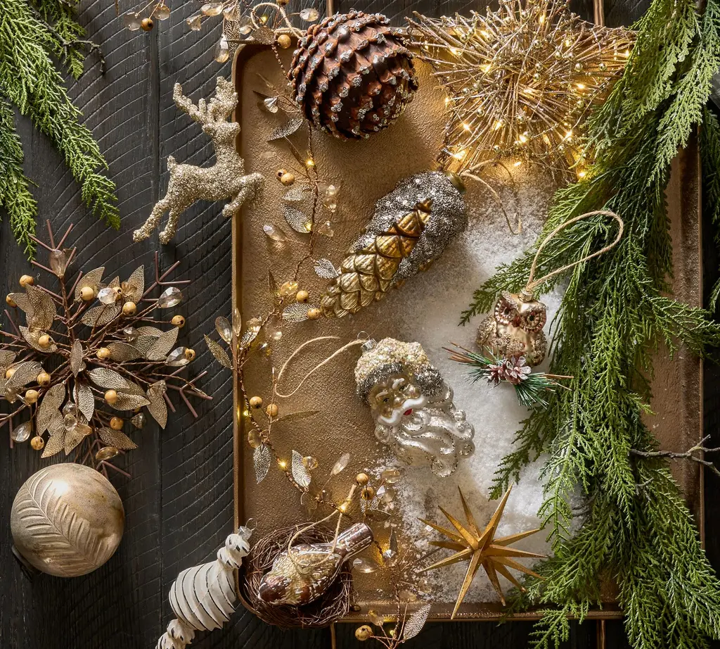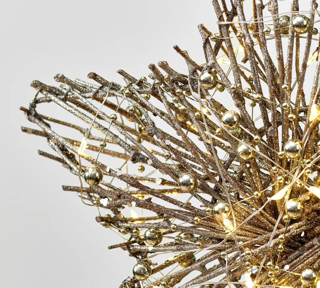Brighten your tree with a celestial body brought down to earth. Rustic and gilded, our woven, rattan star is bedazzled with beads and illuminated with fairy lights. Hang several from the tree or pile them in an artisanal bowl to add dimension, texture, and glow.
