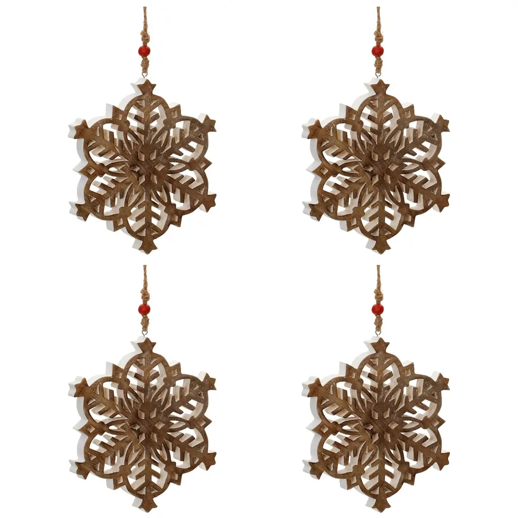 Description:Add a woodland touch to your Christmas tree with this stunning set of Wood Snowflake Ornaments. Featuring four pieces, the natural wood grain finish paired with the ornate snowflake design and white washed accents are the perfect combination to create a memorable display. The quality mango wood composition with beaded jute string hanger is sure to endure for seasons to come. Whether you're adding a touch of cheer to your home or gifting to a loved one, these ornaments will definitely bring holiday spirit to your home. Specification: