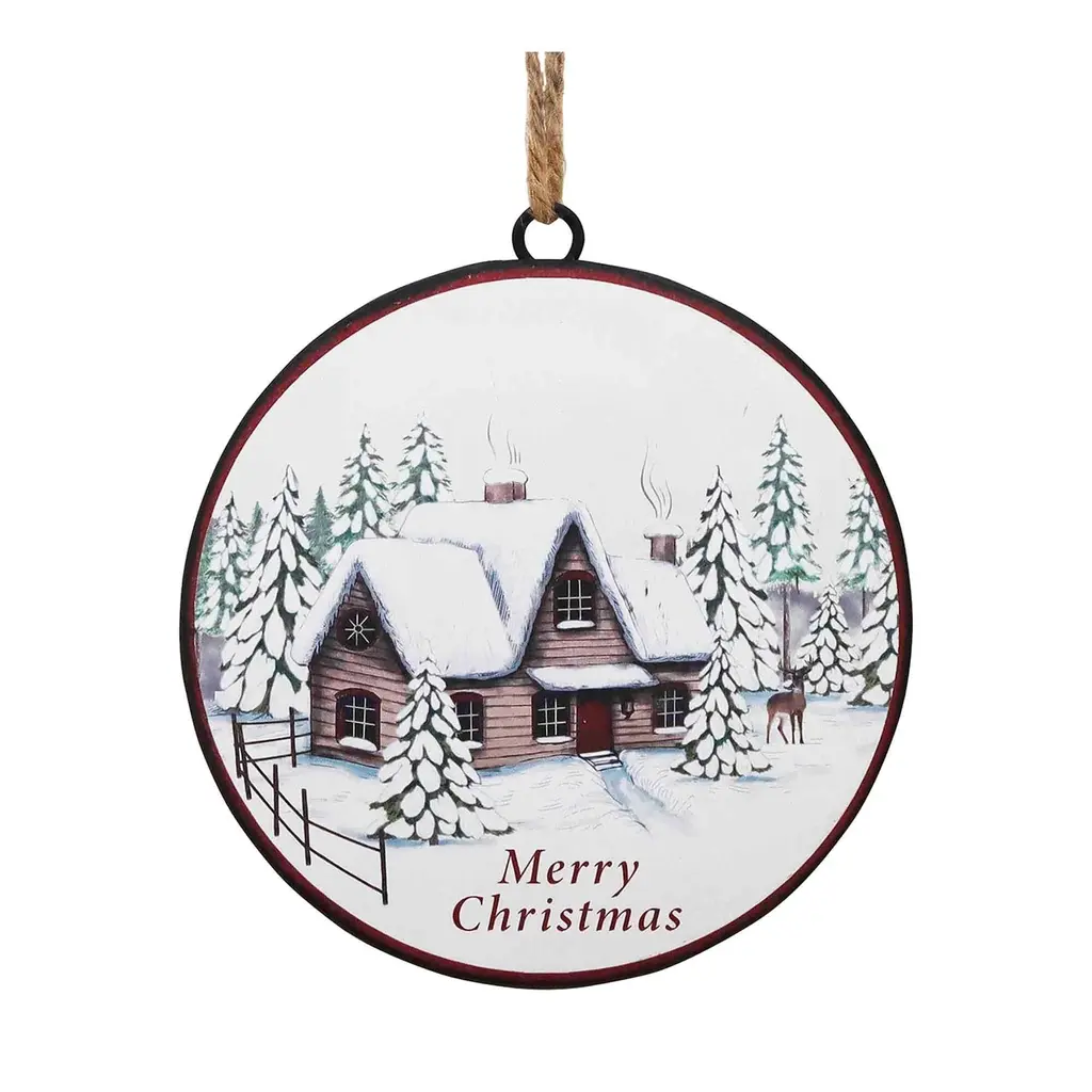 Elevate your Christmas tree's charm with our stunning set of disc ornaments. These joyful decorations feature wintry white and red tones, a delightful woodland cabin, and a pine tree design. Whether for your home or as a heartfelt gift, these ornaments promise enduring smiles and a touch of woodland magic for your holiday celebrations. Product Features: Christmas disc ornament One-sided ornament Showcases message "Merry Christmas" Woodland cabin and pine tree design Comes ready-to-hang on a jute cord For indoor use only Dimensions: 6" high x 6" diameter Material(s): iron/jute Note:Set includes 12 pieces of the item shown