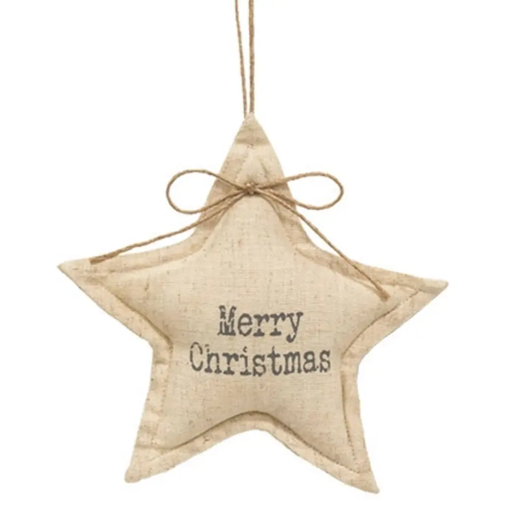 Specification:Description:The Merry Christmas Natural Star Ornament is a charming stuffed fabric ornament designed in rustic farmhouse style. Made from cream-colored fabric with a soft and sturdy texture, it features stitched edges and stamped gray text that reads "Merry Christmas," adding a vintage touch. Completing its rustic appeal is a jute bow and hanging loop, allowing for effortless display by hanging on Christmas trees, garlands, wreaths, or anywhere else to enhance holiday decor with its cozy and festive charm.