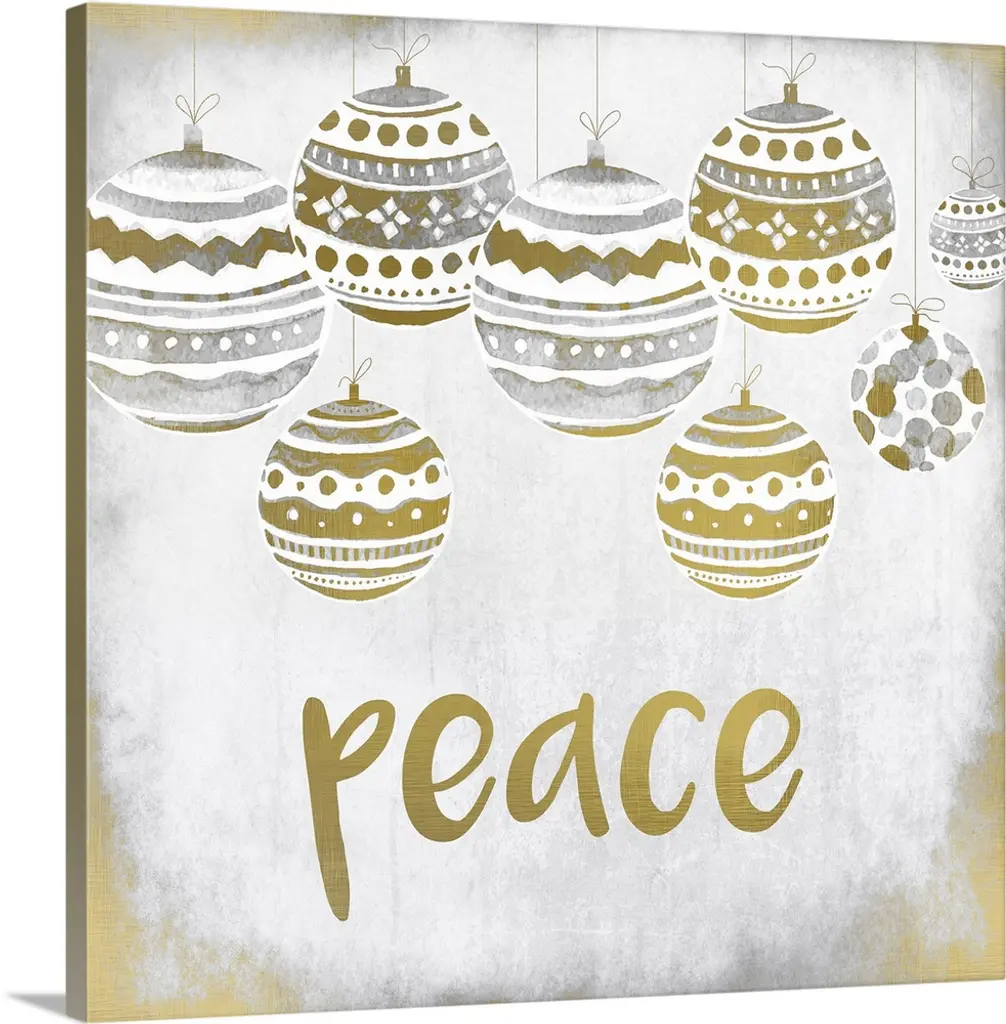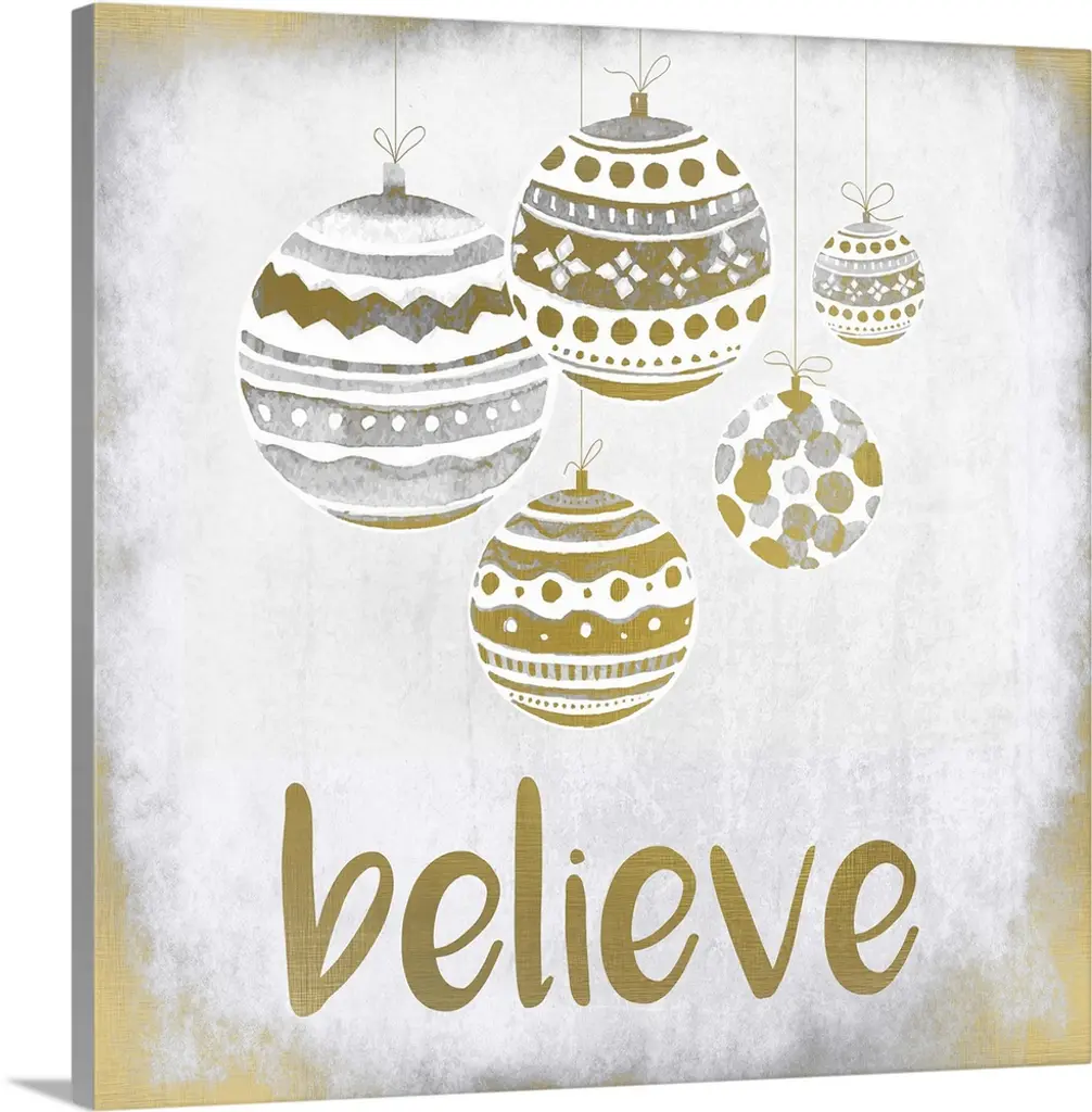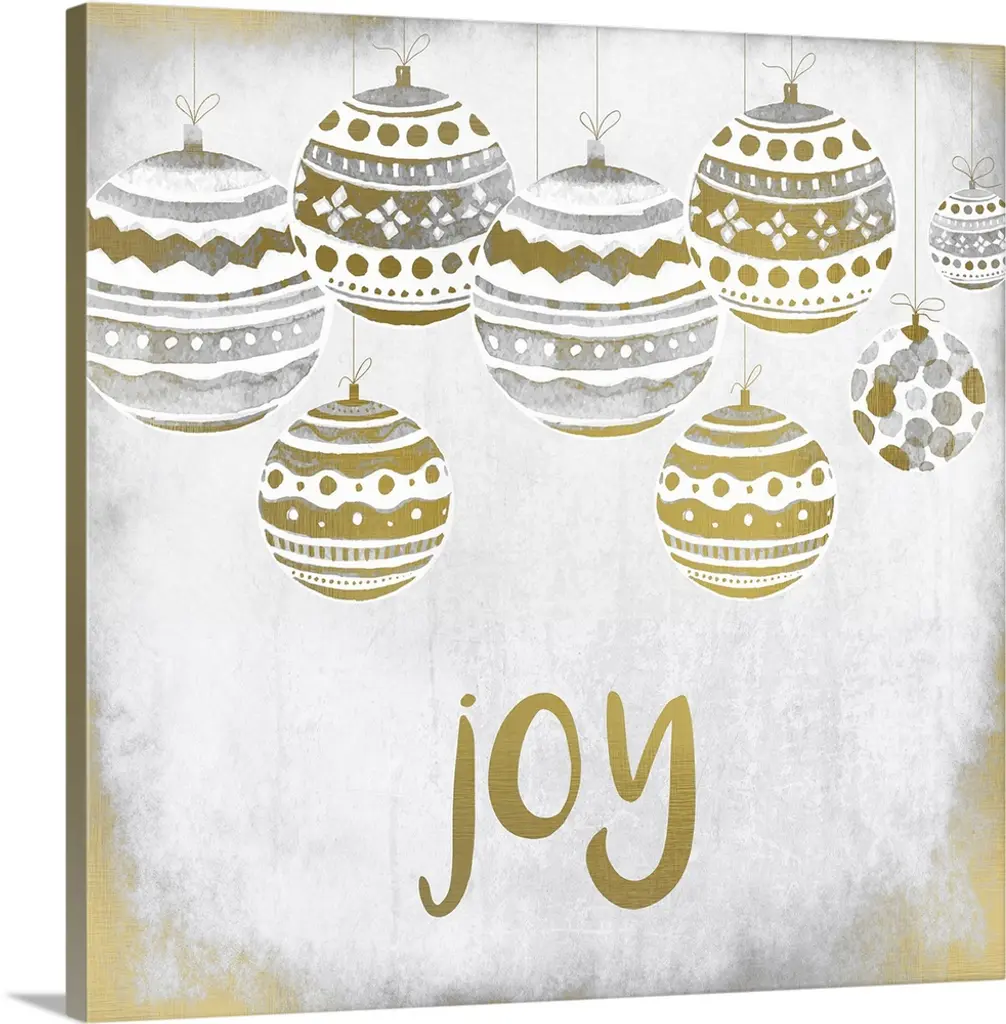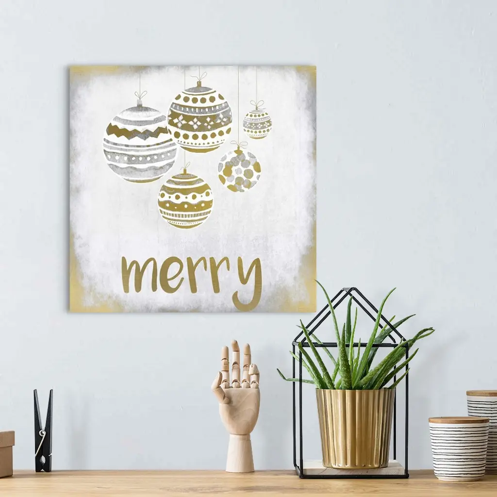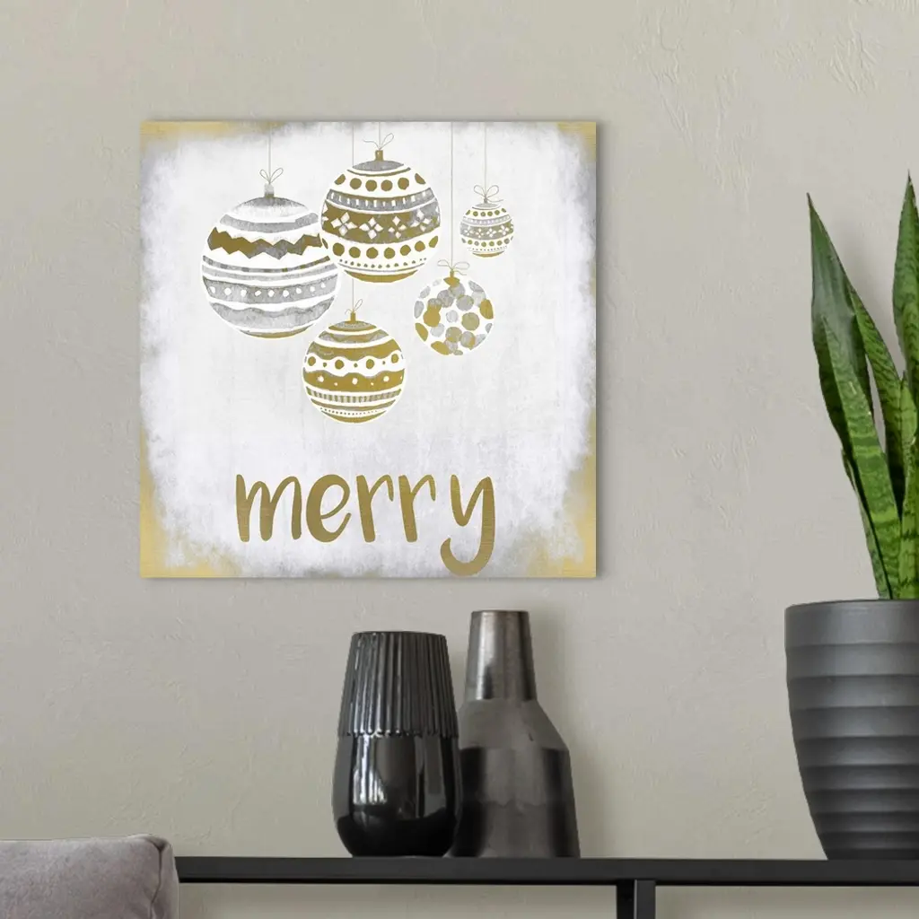 Gold and silver holiday ornaments hanging over the word "Merry."