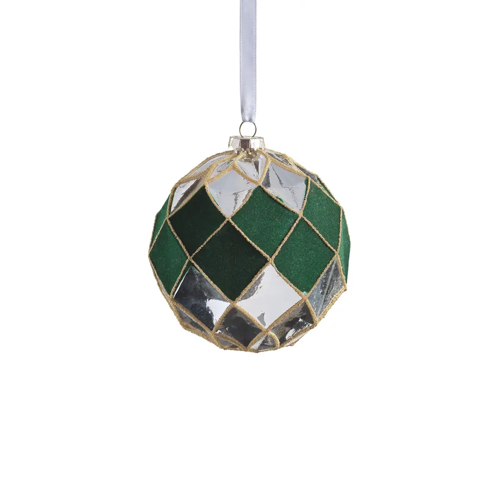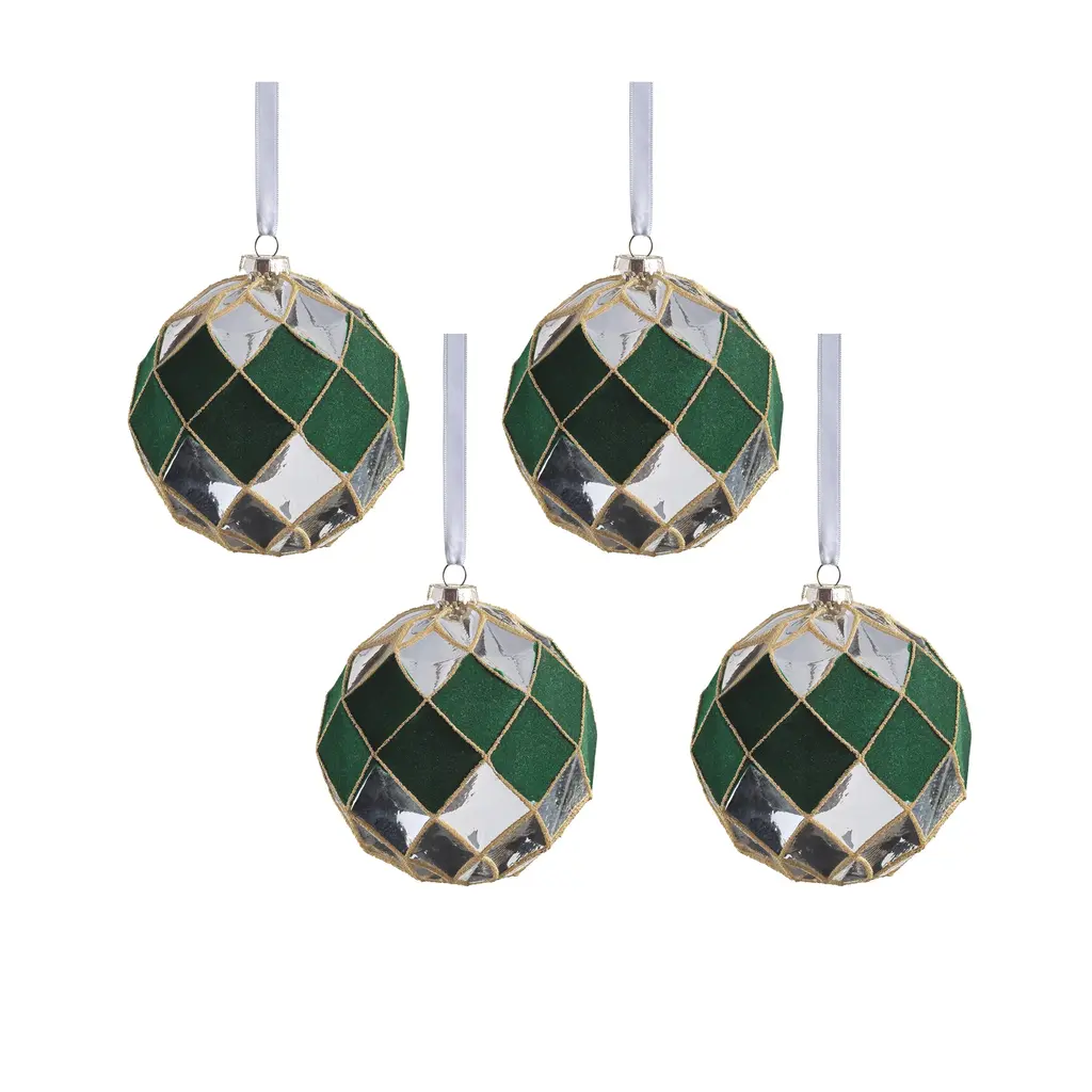 Elevate your holiday decor with the exquisite Messina Verde Glass Ornaments. These stunning ornaments feature a shiny finish with glittered edges along their diamond-shaped facets, adding a touch of sparkle and elegance. The midsection of each ornament is adorned with a luxurious velvet-like texture, creating a beautiful contrast of textures. Perfect for your Christmas tree or as decorative accents, the Messina Verde Glass Ornaments will bring a sophisticated and festive charm to any setting. Features: Set of 4 hanging ornaments of the same size Glittered diamond-shaped facets Flock and shiny finishes for sophisticated and tactile contrast Equipped with ornament cap A fun and festive addition to any holiday décor Comes ready to hang