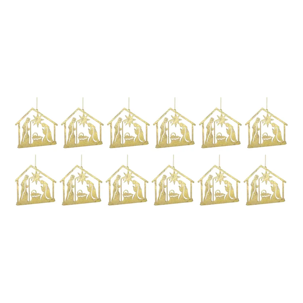 Description: Add a religious touch to your Christmas Tree with this beautiful set of Metal Holy Family Cut Out Ornaments. Featuring 12 pieces, this set's chic gold finish, traditional nativity scene outline, and cut-out metal design are the perfect combination to create a memorable display. The quality metal composition with delicate gold string hanger is sure to endure for seasons to come. Whether you're adding a touch of cheer to your home or gifting to a loved one, these ornaments will definitely bring smiles to your home. Specification: