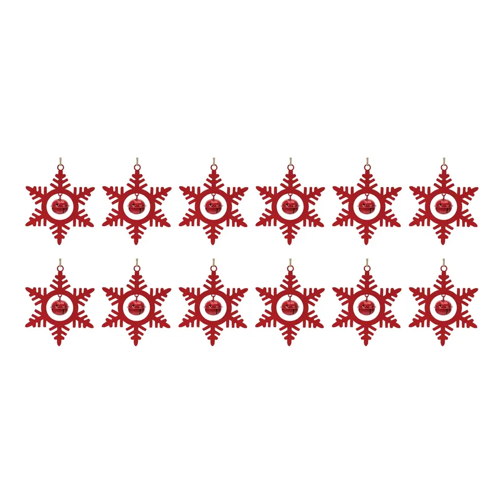 Add a traditional touch to your Christmas Tree with this beautiful set of Metal Snowflake with Bell Ornaments. Featuring 12 pieces, this set's festive red tones, traditional snowflake design, and hanging sleigh bell accents are the perfect combination to create a memorable display. The quality iron metal composition with delicate jute string hanger is sure to endure for seasons to come. Whether you're adding a touch of cheer to your home or gifting to a loved one, these ornaments will definitely bring smiles to your home.