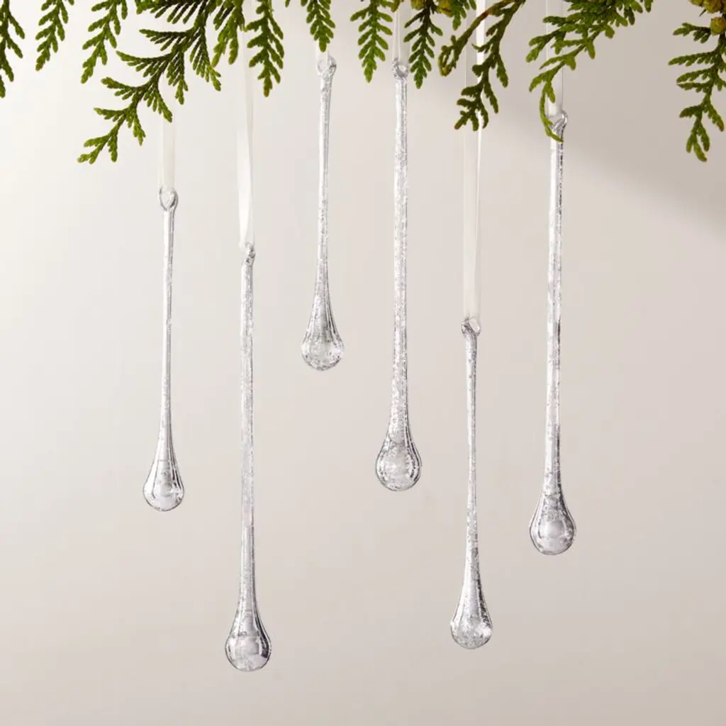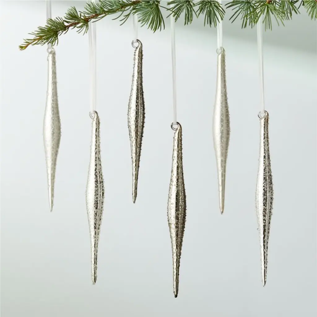 With a slender and wintry flair, the metallic icicles add a little dazzle to the tree. Hand-cast from Borosilicate glass, the ornaments are covered in a subtle blanket of frost-like texture. Set of six in three different tones: silver, pewter and matte white. CB2 exclusive.